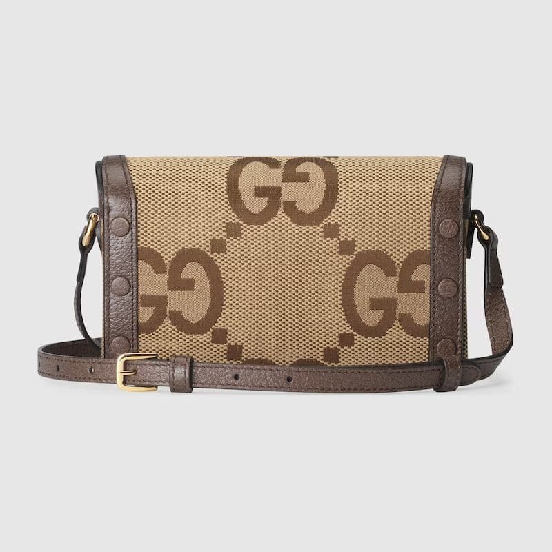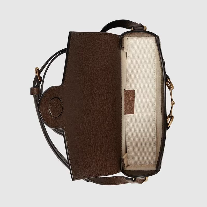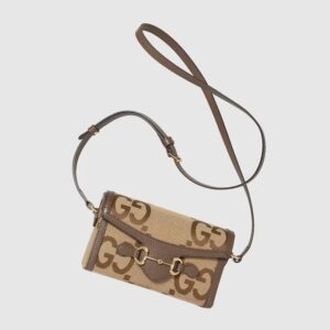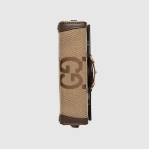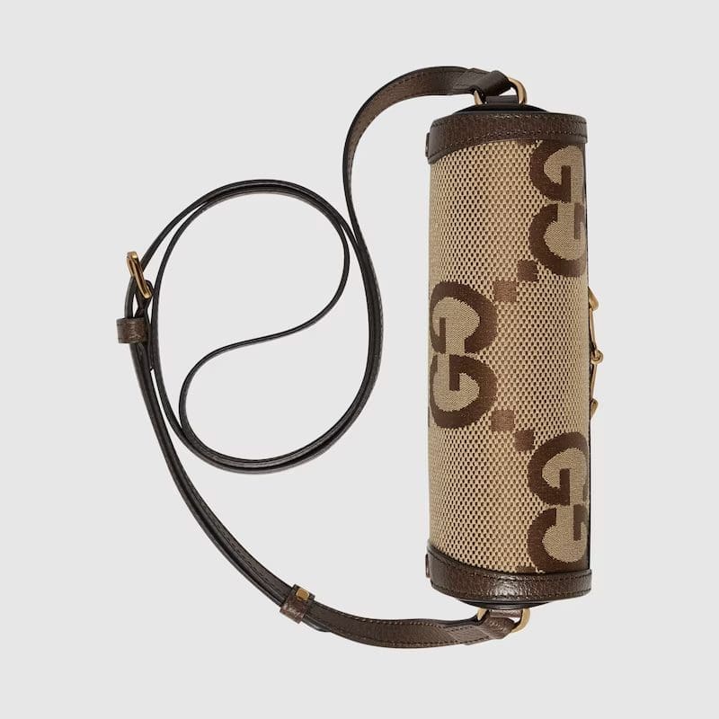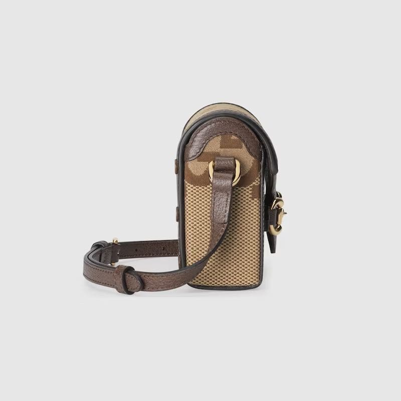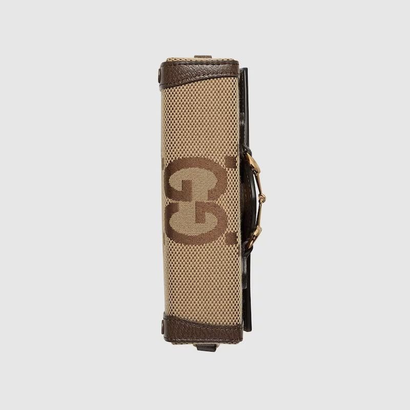A part of the Gucci Horsebit 1955 universe, this bag’s mini shape draws attention to the line’s signature hardware. As a reimagination of Guccio Gucci’s initials, the GG logo appears in a maxi size across the camel and ebony canvas.