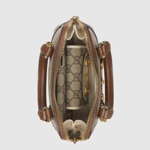 A new introduction to the Gucci Horsebit 1955 line, the mini top handle is crafted from the House’s monogram canvas with contrasting brown leather details. The collection unifies details first introduced on the original bag that inspired the line from over six decades ago with a modern spirit, highlighting the Horsebit. Part of Gucci’s genetic code, the double ring and bar design has been established as one of the most distinctive elements among the House symbols borrowed from the equestrian world.