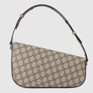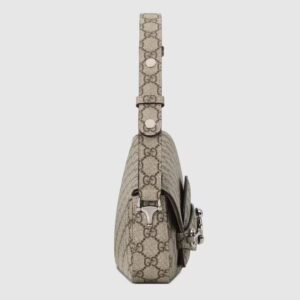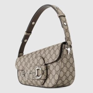 As the historic Horsebit hardware celebrates its 70th anniversary, the House looks at new ways of combining archival features with contemporary silhouettes. Introduced as part of the latest Cruise 2024 collection, this Supreme canvas Gucci Horsebit 1955 handbag is defined by an asymmetrical shape that lends a modern feel to the renowned line.