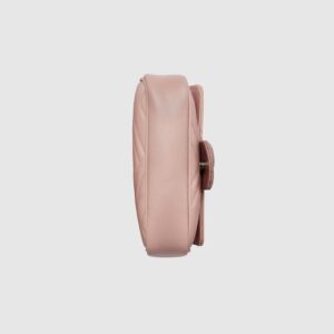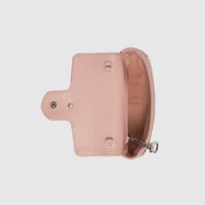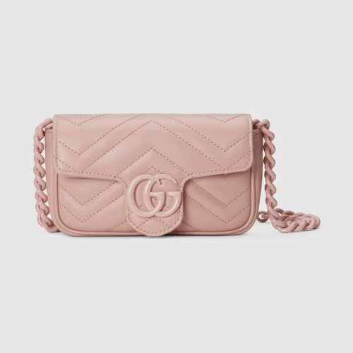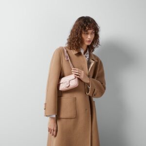 Accessories continue to come to the fore of the Creative Director’s collections. A distinctly contemporary accessory, the belt bag is presented in new ways throughout the Gucci narrative, emphasizing different elements of the versatile style. Here, it is introduced as part of the GG Marmont universe in pink chevron matelassé leather with a chain strap.