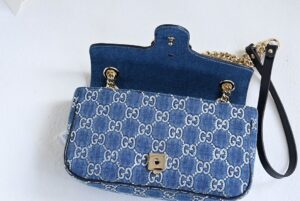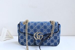 Inspired by the summer spirit and beach clubs on the Italian coast, this item is part of Gucci Lido. The small GG Marmont chain shoulder bag has a softly structured shape and an oversized flap closure with Double G hardware. The sliding chain strap can be worn multiple ways, changing between a shoulder and a top handle bag. Made in blue GG denim with a tonal dark blue trim.