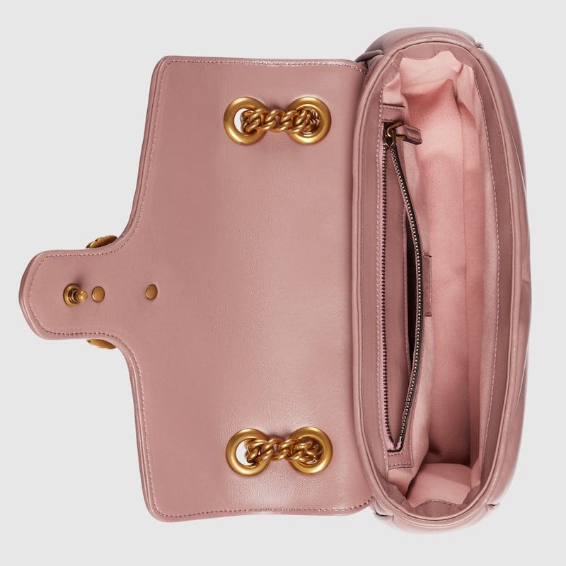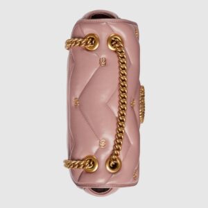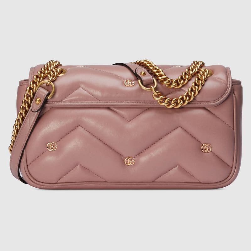 The GG Marmont shoulder bag presents a softly padded version of the pink GG Matelassé leather with small Double G studs, and a twisted torchon Double G embellishment. The sliding chain strap smoothly transforms from a single shoulder length to a doubled top handle length for multiple ways to wear the bag.