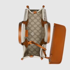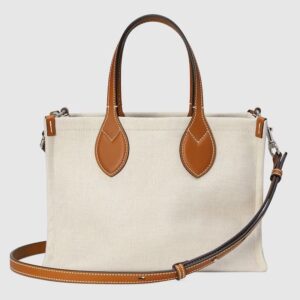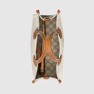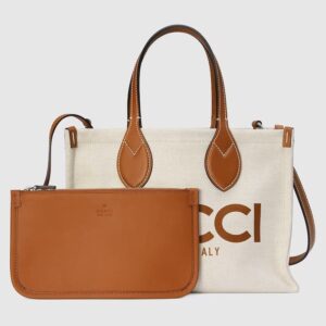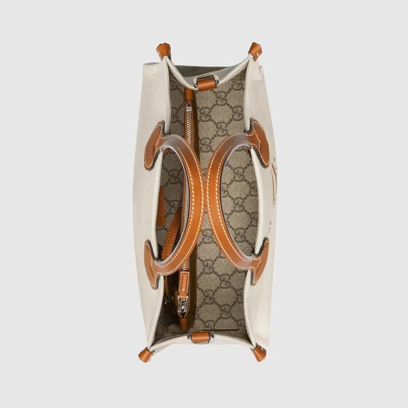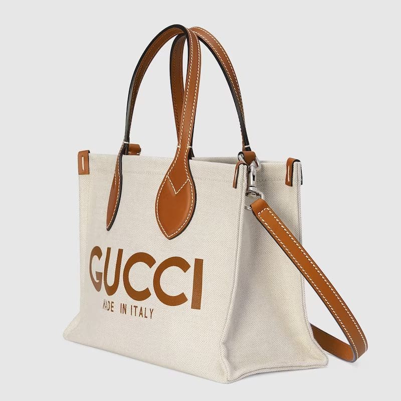 Well-known prints of the House constantly evolve to tell a unique narrative. An essential storytelling element of the Cruise 2024 collection, the ‘Gucci Made in Italy’ print defines this beige canvas tote bag with a light brown trim and GG Supreme lining.