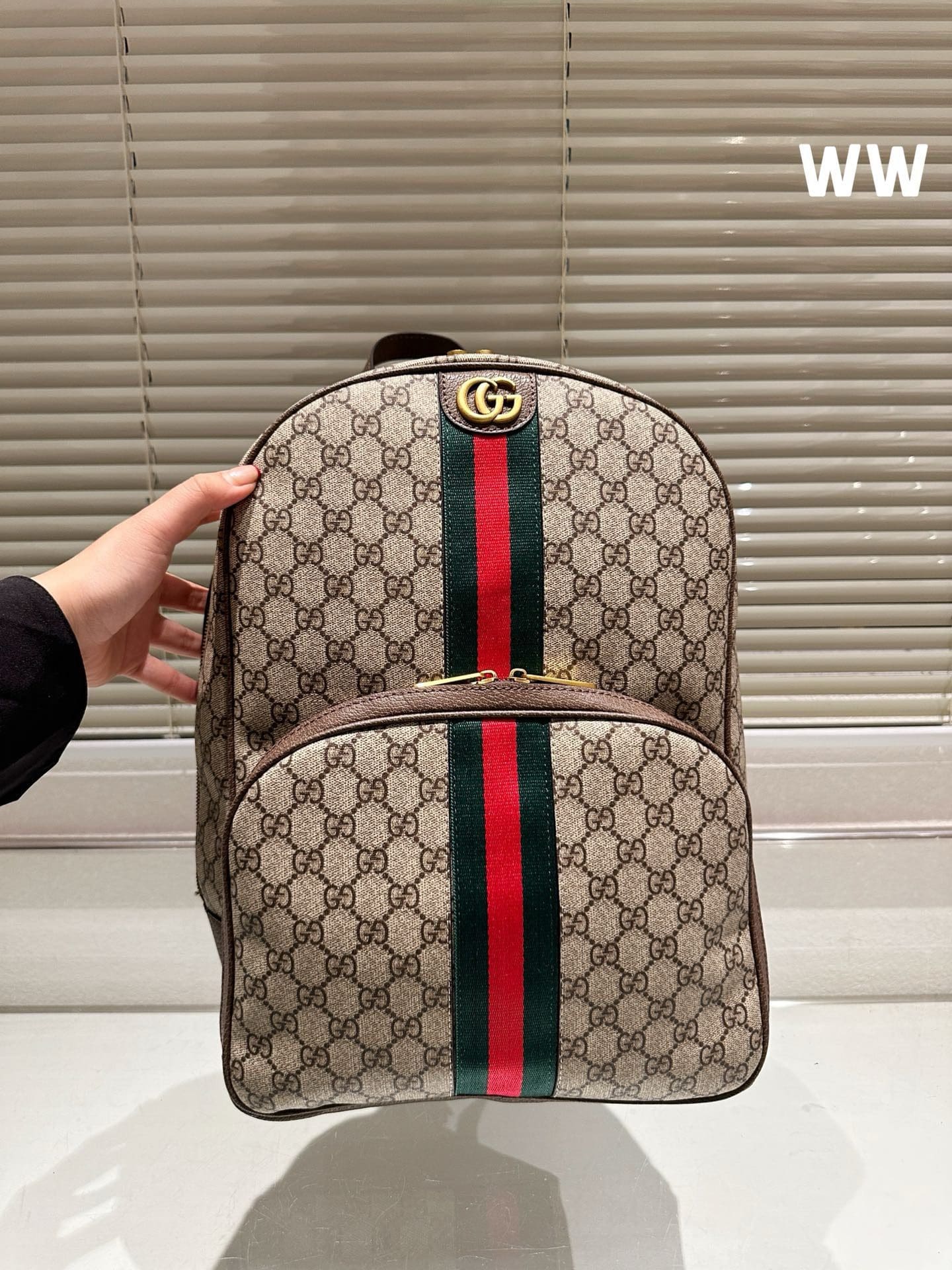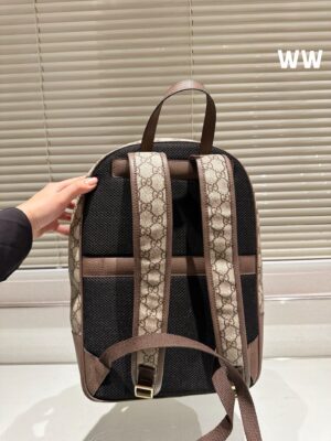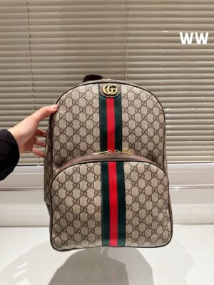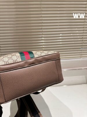 The Web stripe and Double G hardware, distinctive design elements synonymous with the Ophidia line, continue to enrich new leather accessories year after year. This backpack appears as part of the offering for the men’s Spring Summer 2024 collection.
