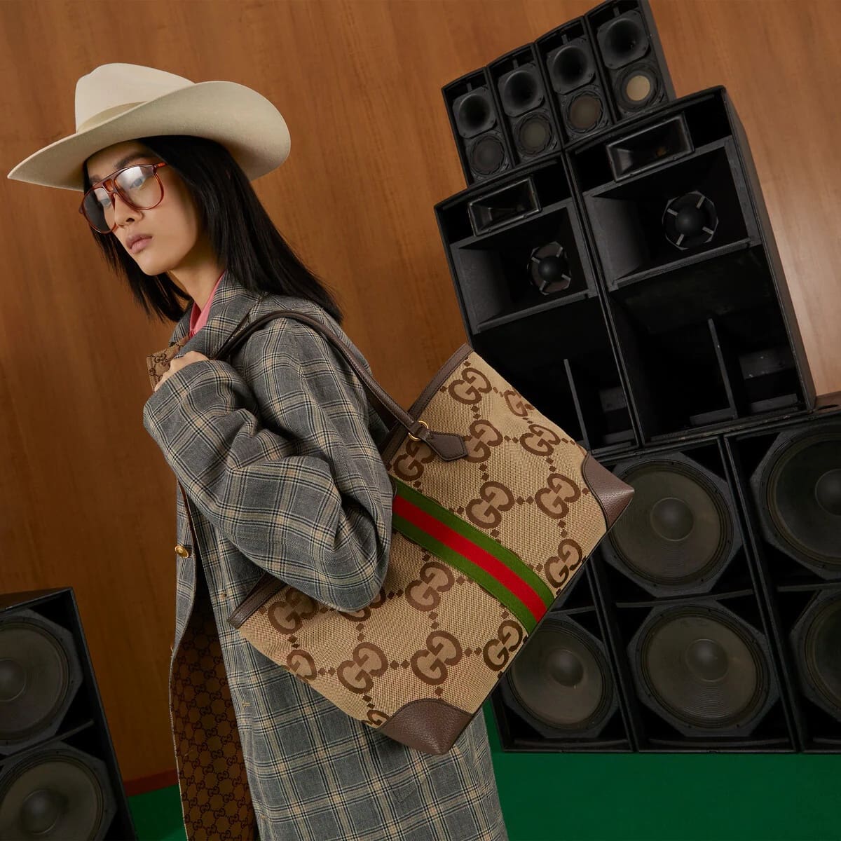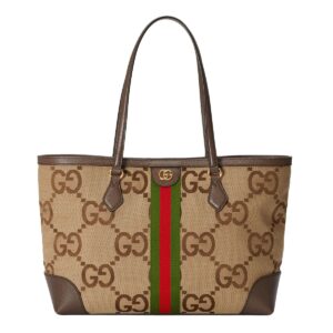 Marking the House’s first in-person fashion show since February 2020, Gucci Love Parade unfolded along Los Angeles’ walk of fame. Inspired by the timeless nature of old-Hollywood glamour, the collection presents contemporary takes on traditional pieces. This Ophidia medium tote is presented in GG canvas – a reimagination of Guccio Gucci’s initials in a maxi size.