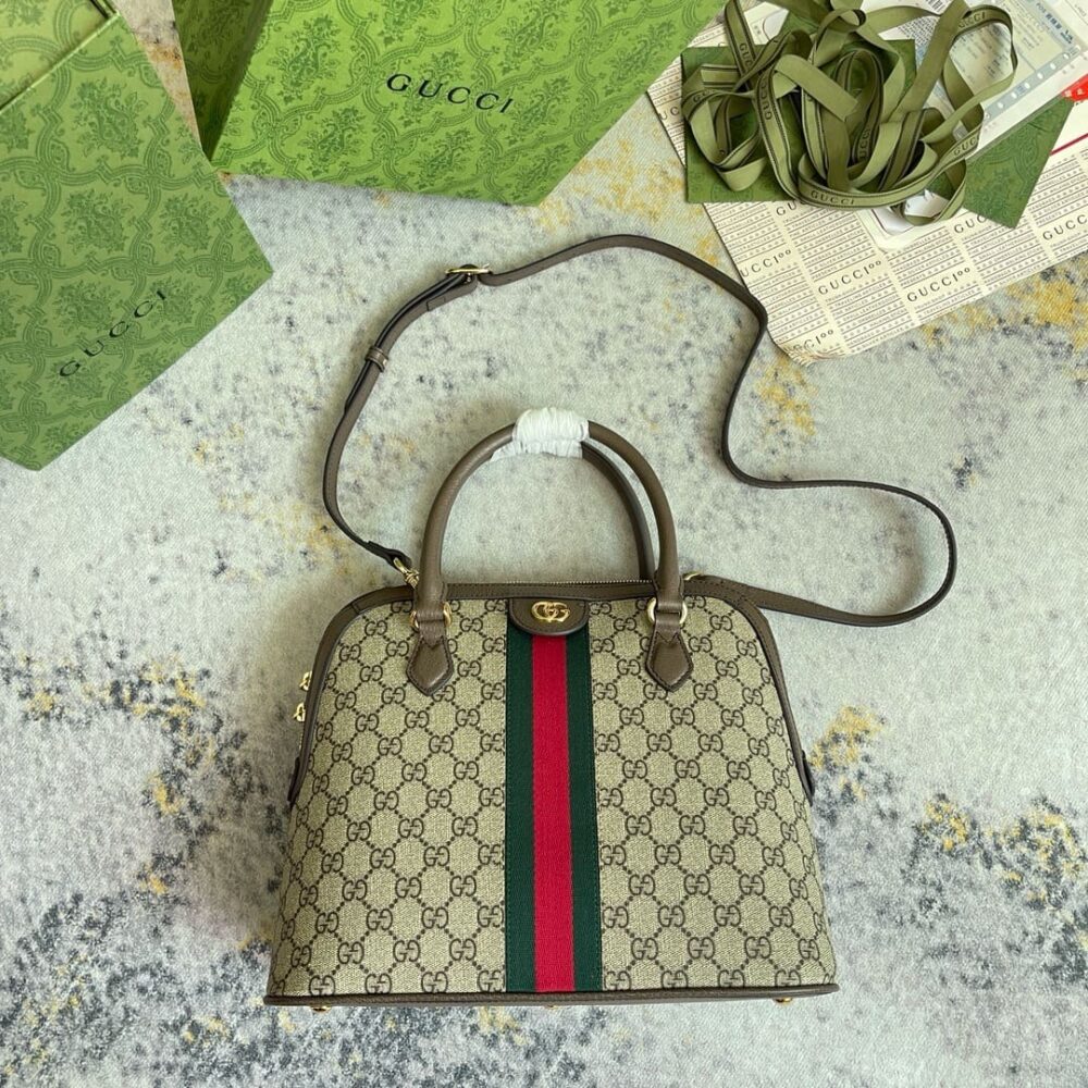 The world of Ophidia continues to evolve with new iterations for the Pre-Fall collection. This medium-sized top handle bag is made of beige and ebony GG Supreme canvas and has a detachable shoulder strap. The House iconic Web stripe and Double G hardware complete the piece.
