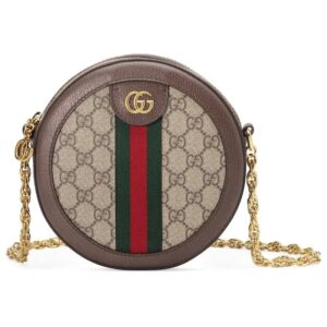 The world of Ophidia evolves with the introduction of a round mini bag with a chain shoulder strap. Crafted in GG Supreme canvas with inlaid green and red Web stripe, the accessory is enhanced by a petite play on the Double G, an archival Gucci code from the ’70s that appears atop a leather tab detail and on the zipper pull.