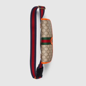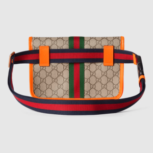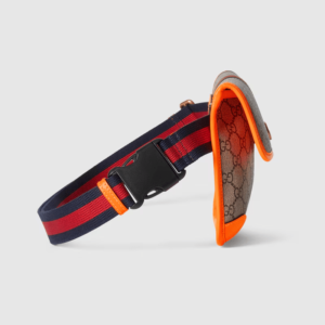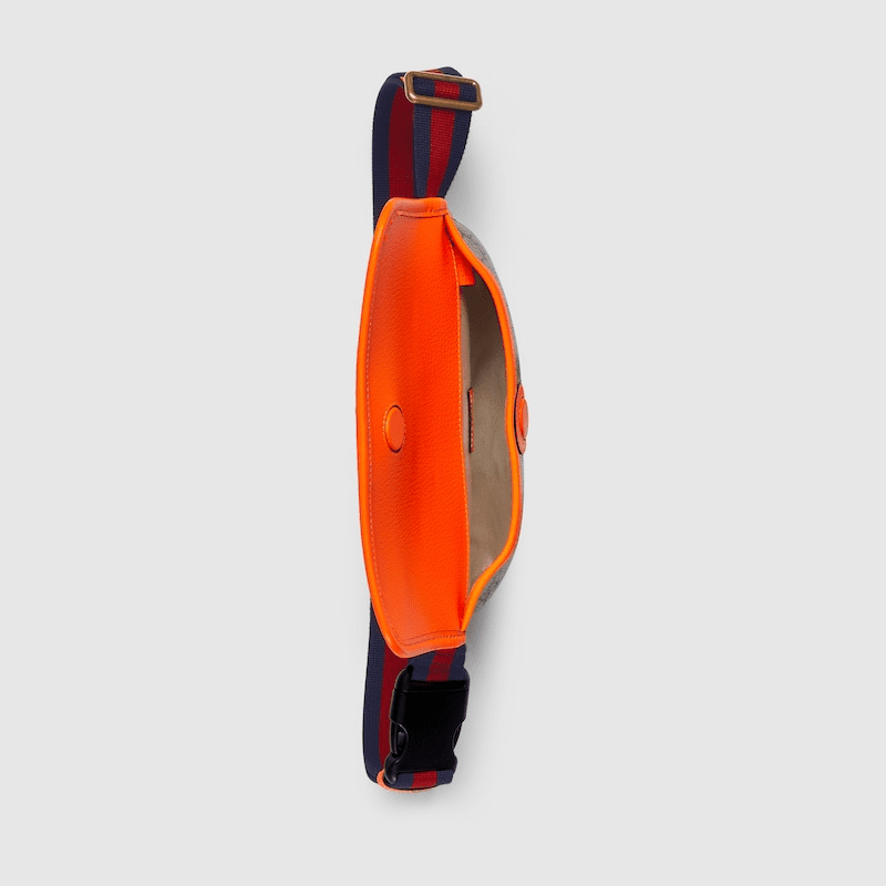 Reflecting the Creative Director’s contemporary vision, the Ophidia lines come to life with a pop of fluorescent orange. Combining the GG motif and Web stripe with a modern hue launches signature travel pieces into the metropolis, such as this small belt bag.