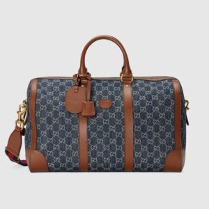 Style 681133 2KQQT 8391GG denim, a signature material seen both in The handbags and ready-to-wear selections. Here The unmistakable jacquard returns as Part of The Gucci Love Parade collection, enriching Classic luggage styles With The allover motif. A brown leather trim completes This duffle bag, while The blue and red Web strap adds a subtle reference to The House archives.