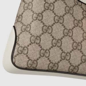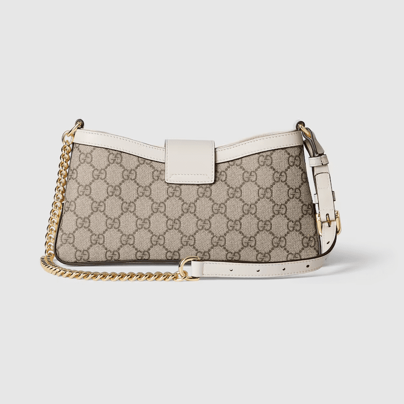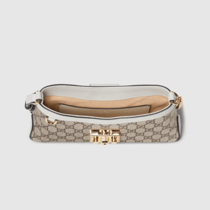 Drawing from the House’s origins as an artisanal luggage atelier, the Padlock closure features prominently on this small shoulder bag in beige and ebony GG Supreme canvas, with white leather trim, and a new adjustable leather and chain strap. It is complete with gold-toned hardware and key with leather holder.