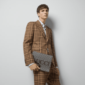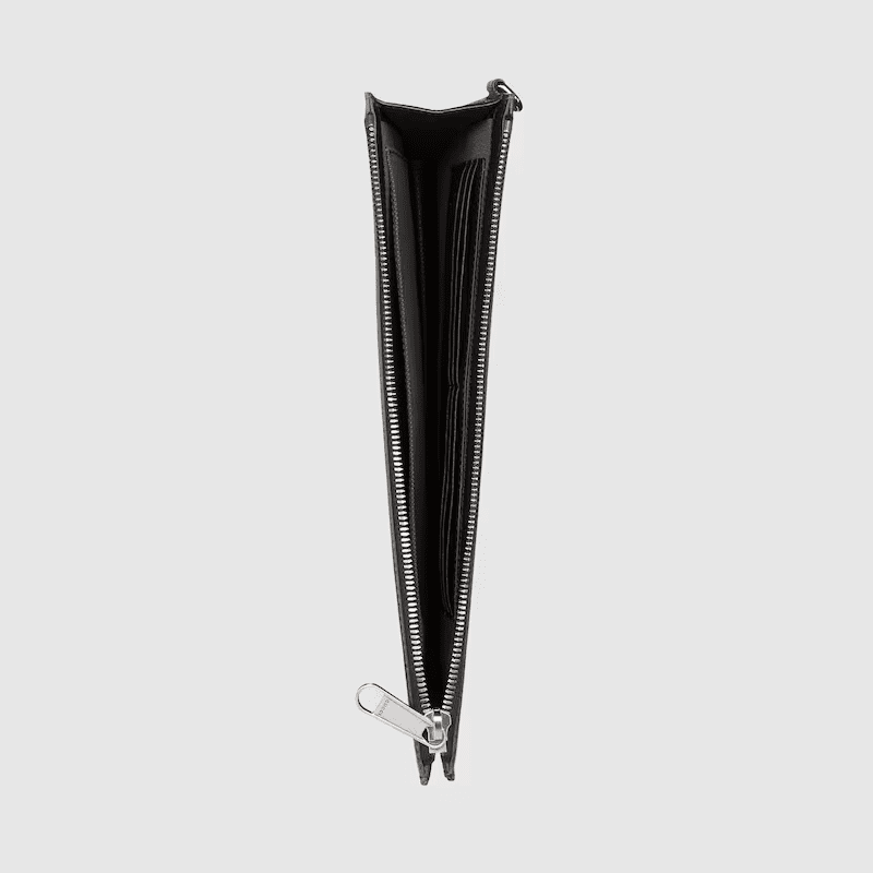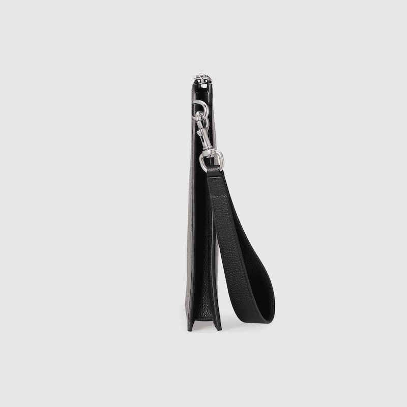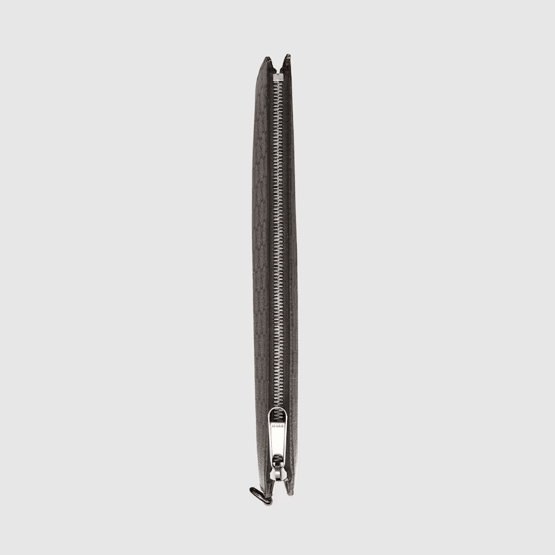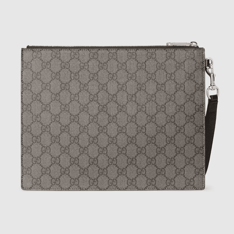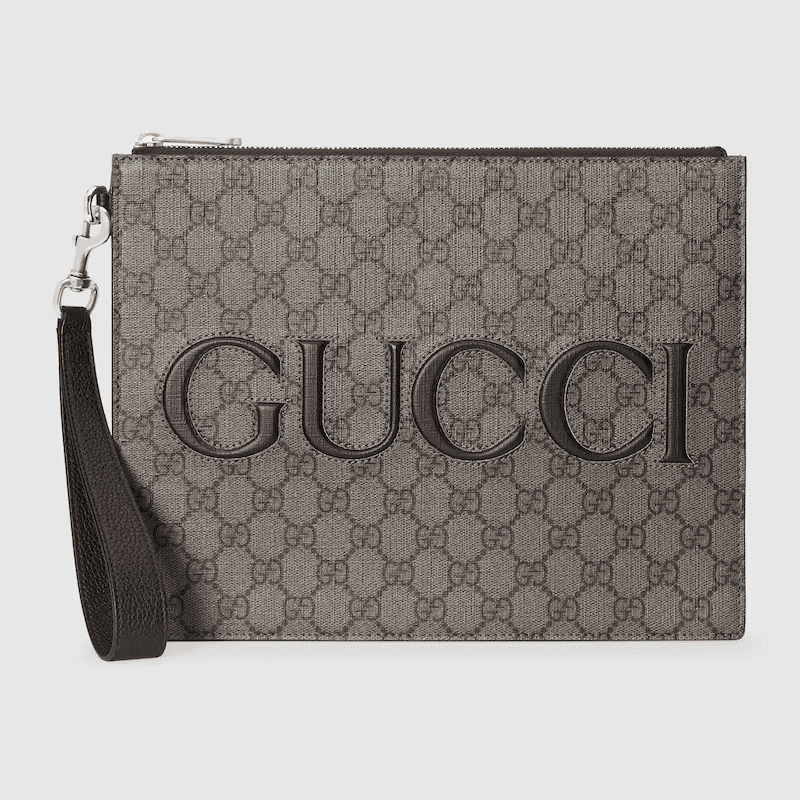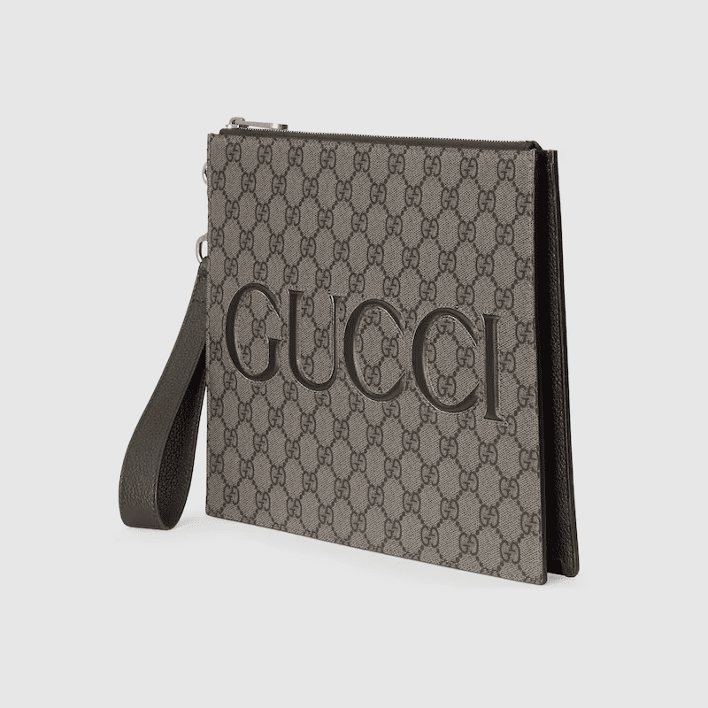 With a new combination of leather and Supreme canvas introduced for Cruise 2024, the name of the House becomes the defining detail of signature small accessories. Here the inlaid Gucci logo appears in black against the grey and black GG Supreme canvas base of this pouch.