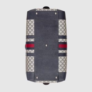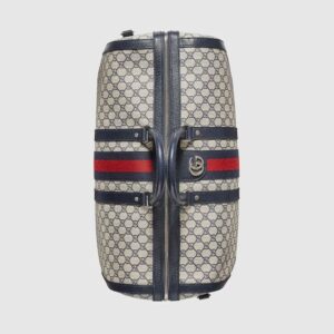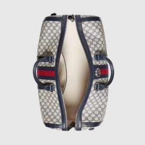 Introduced within the Gucci Savoy line, this duffle bag is crafted from beige and blue GG Supreme canvas combined with the distinctive combination of the House Web with Double G hardware. The top-handle shape is also equipped with an adjustable canvas strap so it can be worn on the shoulder. A secure zipper closure completes the silhouette.