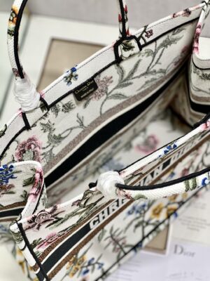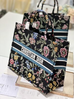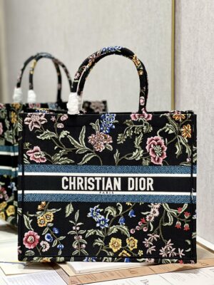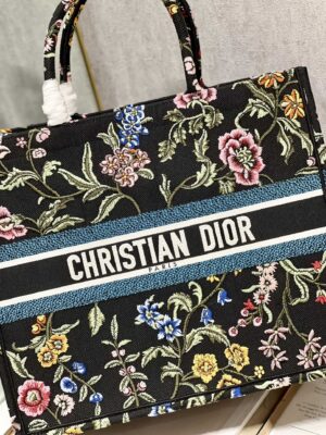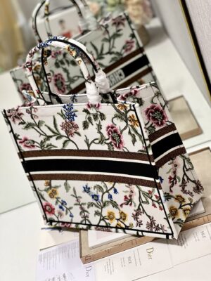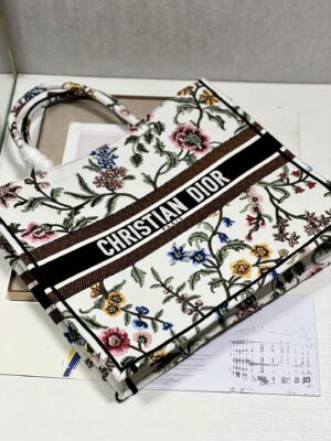 Introduced by Maria Grazia Chiuri, Creative Director of Christian Dior, the Large Dior Book Tote Bag has become a staple of the Dior aesthetic. Designed to hold all daily essentials, the style is fully embroidered with a multicolor Dior Petites Fleurs motif, a romantic and vibrant homage to Mr. Dior’s passion for florals. Adorned with the Christian Dior Paris signature on the front, the small tote exemplifies the House’s signature savoir-faire and may be carried by hand.