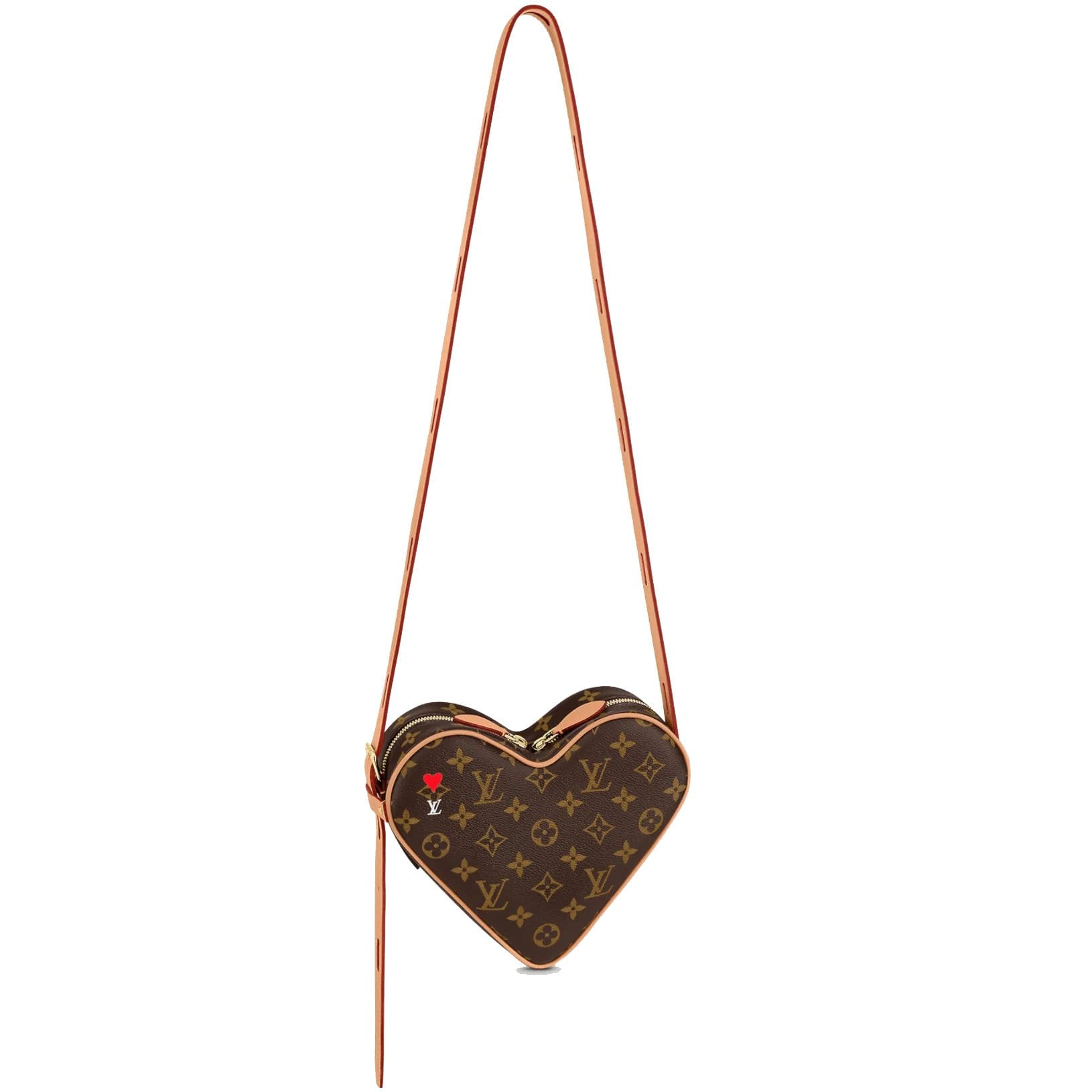 The Coeur is a small handbag in the shape of a heart fashioned from Monogram canvas. For Cruise 2021, Nicolas Ghesquière twists the Monogram pattern by printing a small bright red heart on the top left, echoing the bag’s own form. The adjustable leather strap enables comfortable shoulder and cross-body carry.