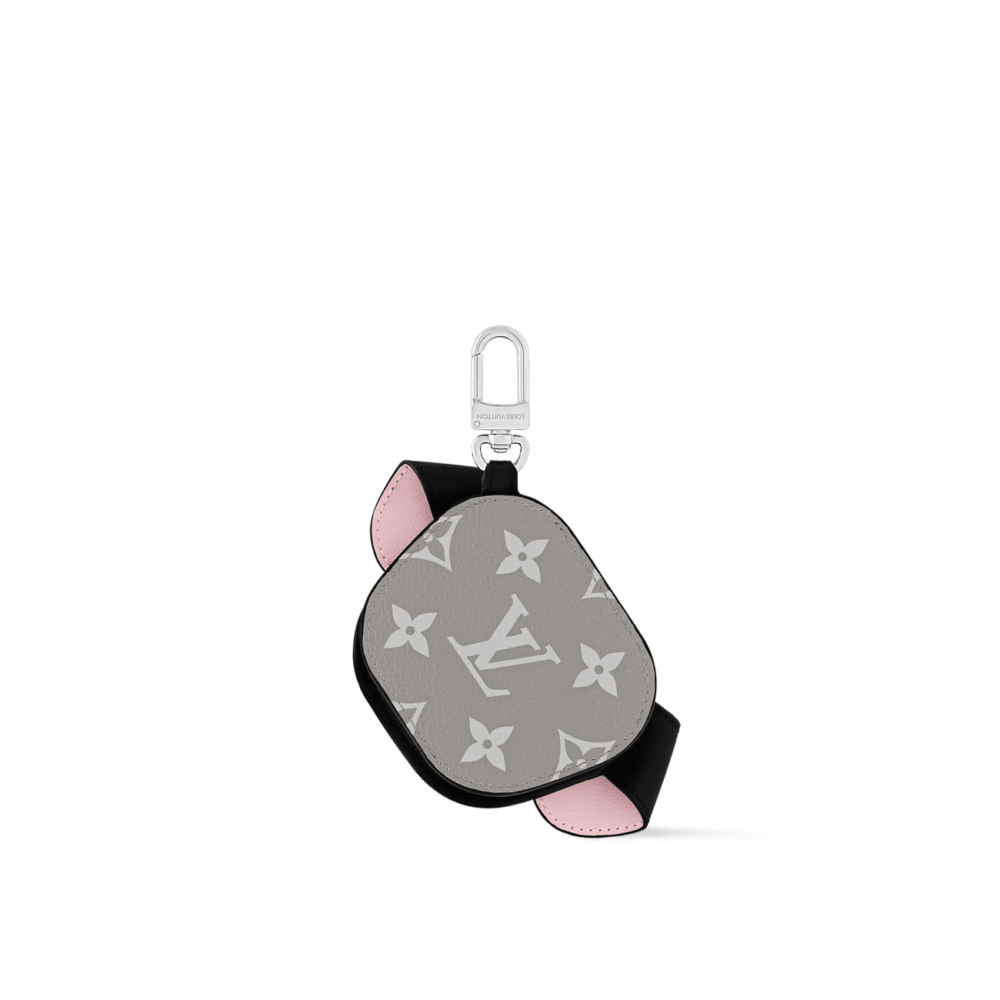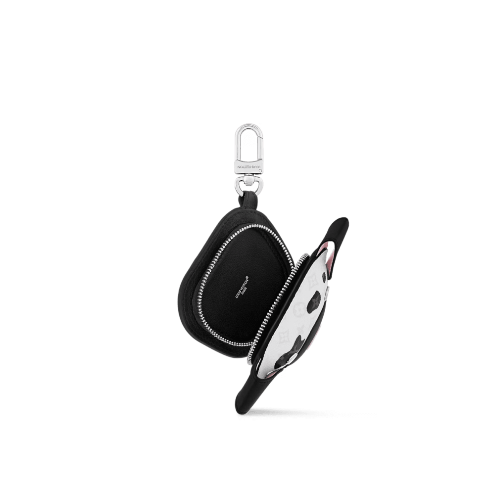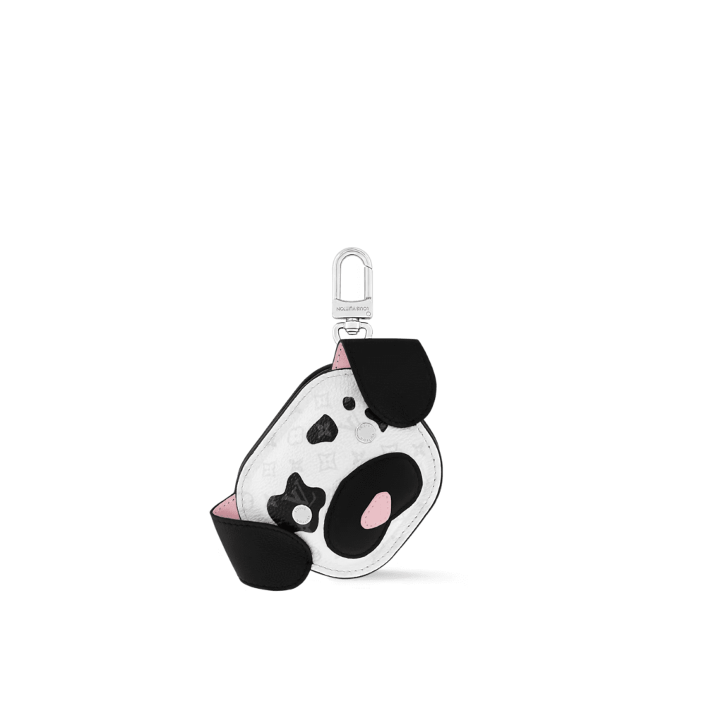 The LV Dog Bag Charm is a delightful decoration that also serves as a pouch to hold earphones or similarly small items. The white face of the dog is covered in a tonal Monogram, complete with floppy black ears, a light pink nose, and silver-studded eyes. The end result makes a thoughtful gift and an adorable addition to any keychain or bag.