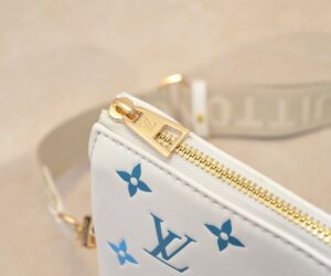 As part of the LV By The Pool Collection, the Coussin PM is made from puffy lambskin with Monogram embossing and a watercolor-style Monogram print. The braided chain plays with the same colorway. It also has a two-sided, wide, removable, and adjustable strap. The interior is composed of two compartments separated by a zipped pocket.