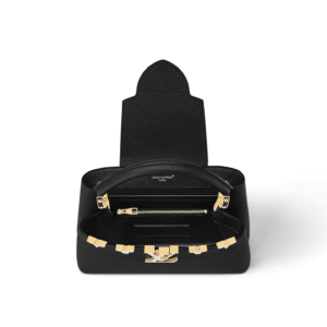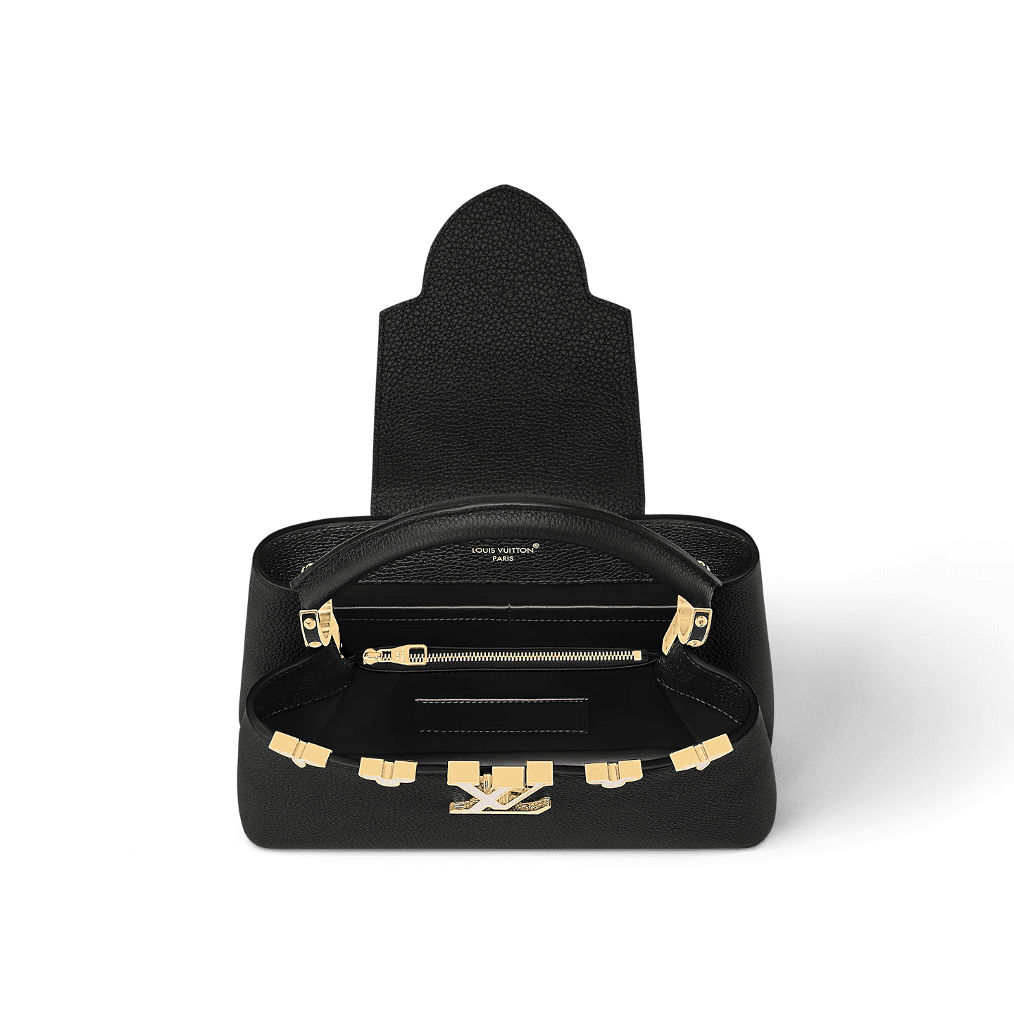 The Capucines MM handbag radiates feminine sophistication in black Taurillon leather, with a crown of Monogram Blossoms in mother-of-pearl around the top of the bag. The elegant colorway and jewel-like flowers make this bag the perfect day-to-evening companion. A top handle and thin removable and adjustable strap give carry options.
