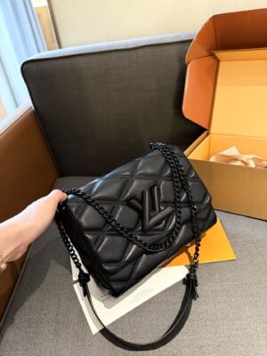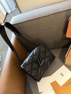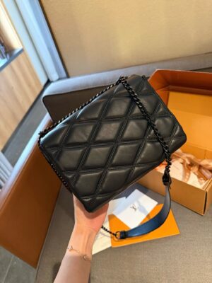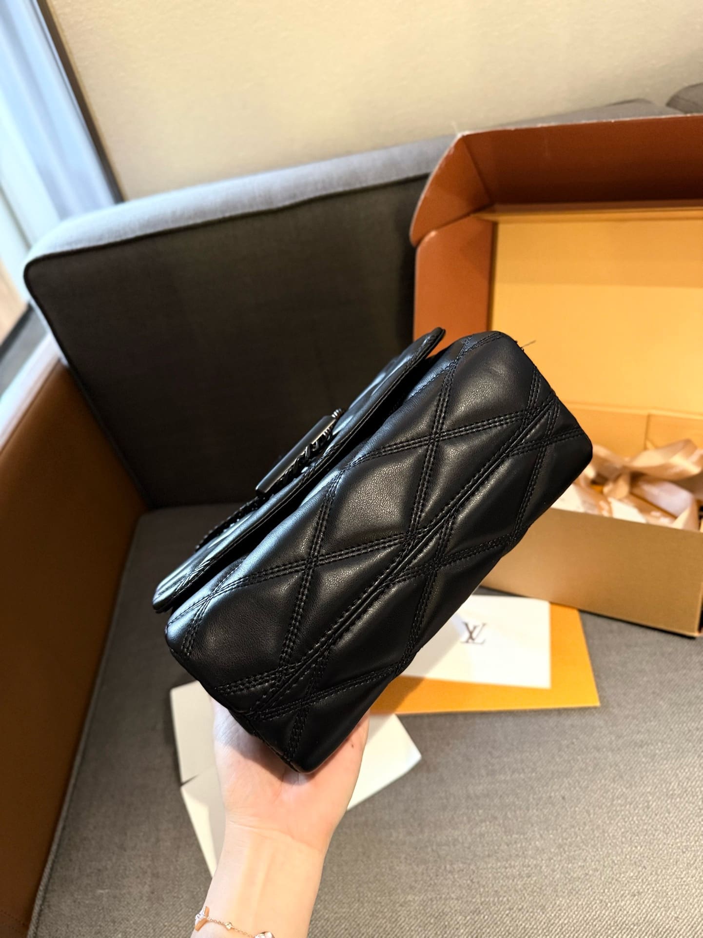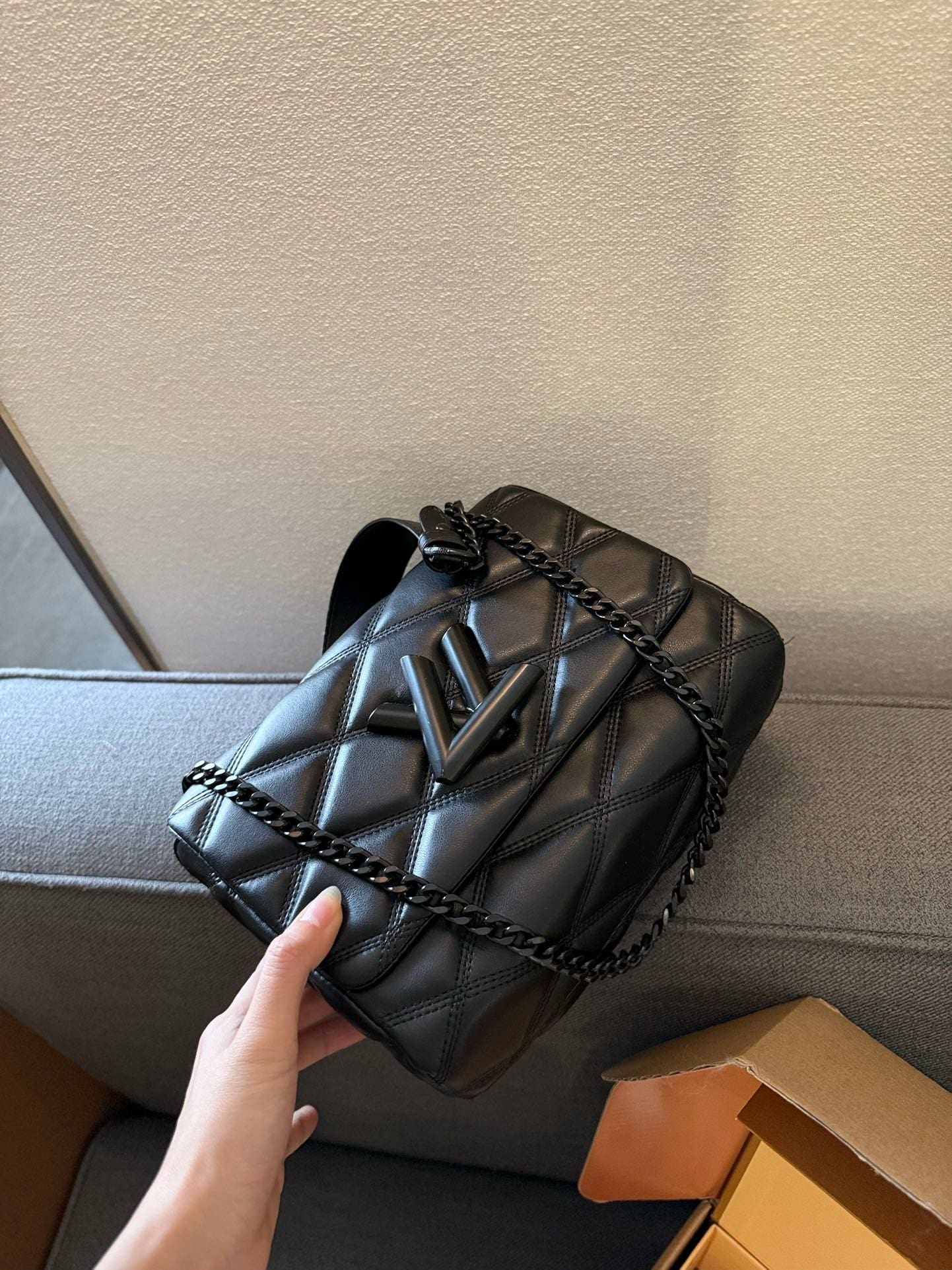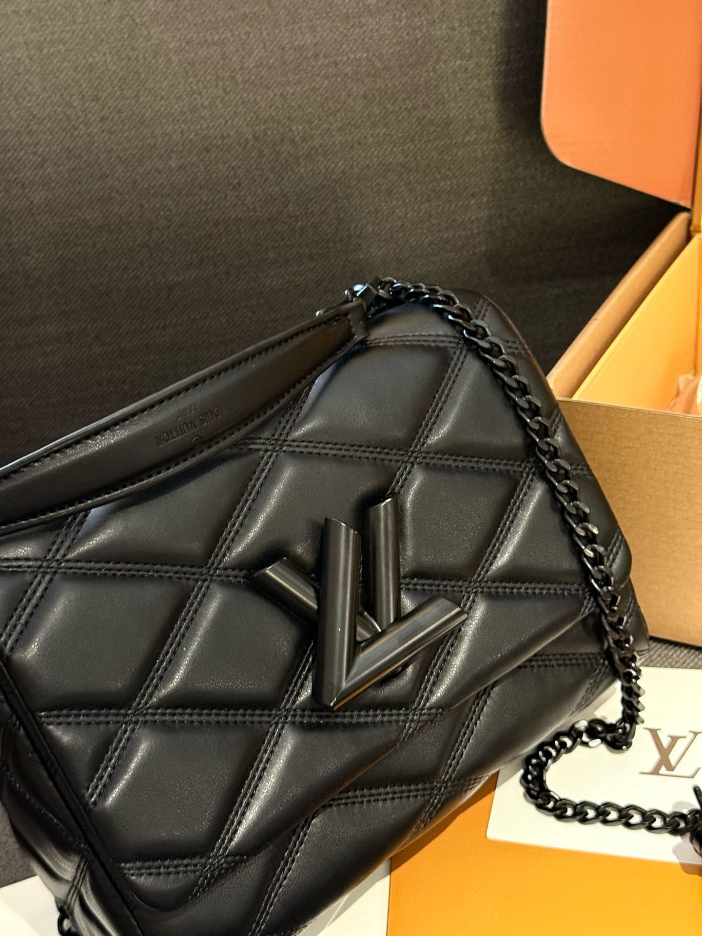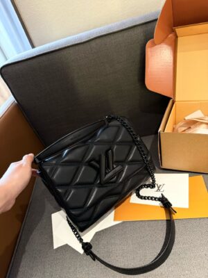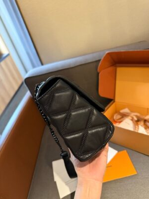 This medium GO-14 bag from the Black Out collection features the brand’s signature Malletage quilting on sheepskin, and matte metal parts such as the LV Twist lock and sliding chain continue the deep tone. The spacious interior is convenient for storing daily necessities, and the patch pocket and mirror complete the overall look.