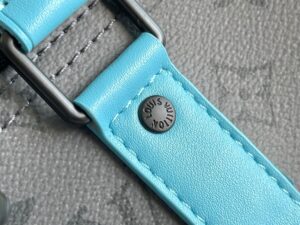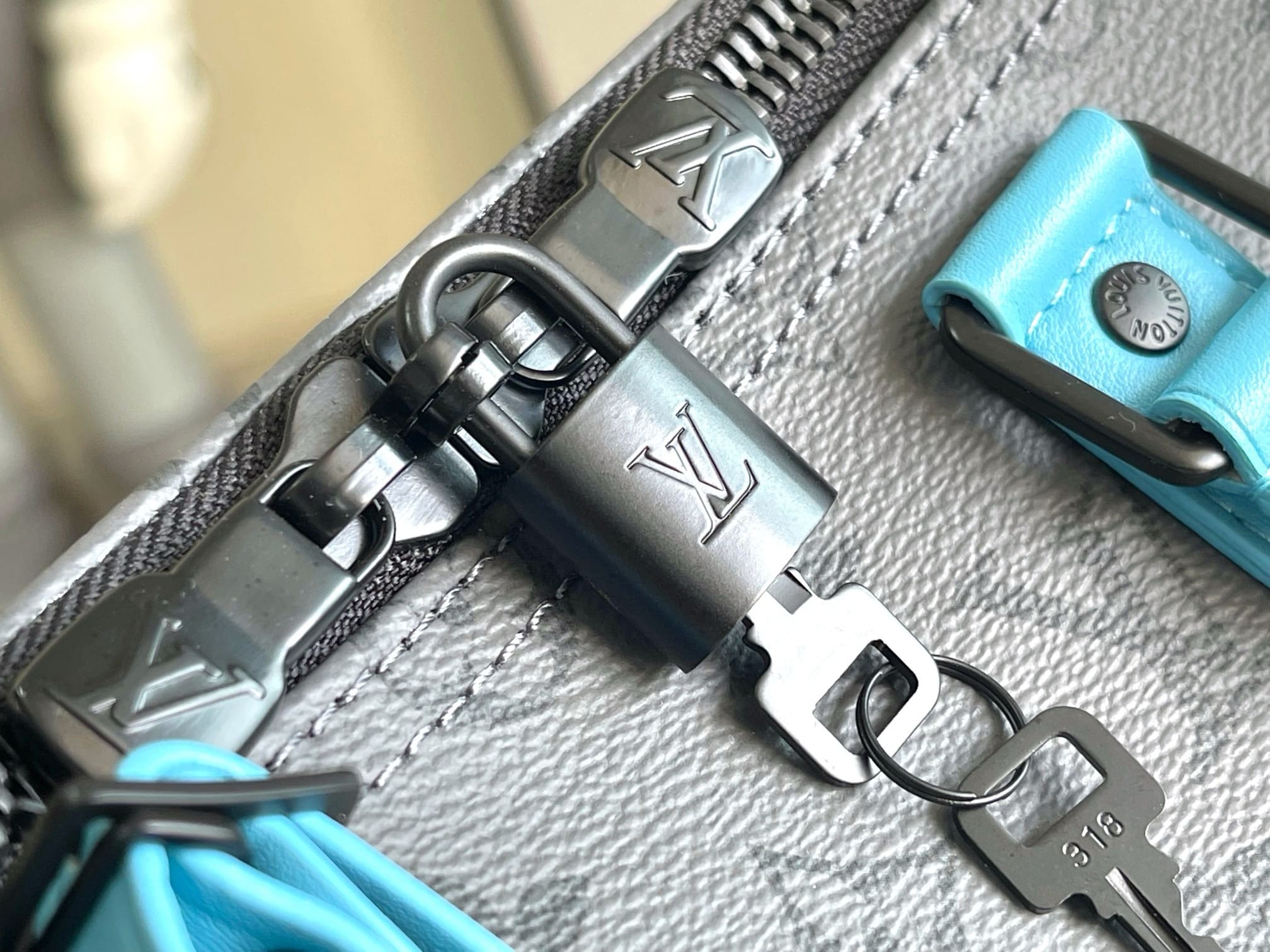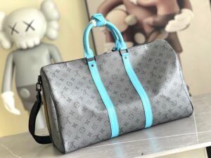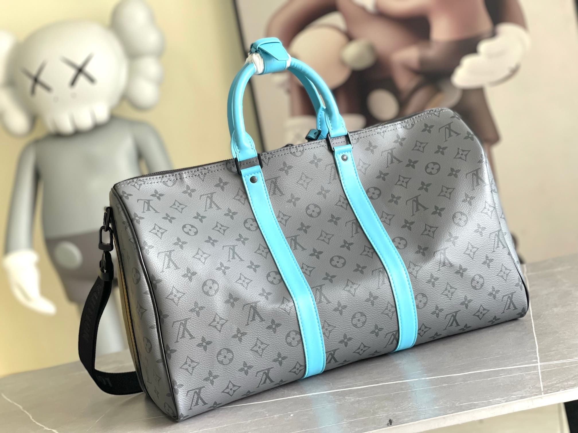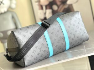Monogram Eclipse Reverse canvas is combined with leather trim in an energetic turquoise color on this Keepall Bandoulière 45. The mix of matte-black hardware and turquoise-blue leather against the grays of the canvas base brings a fresh feel to this carry-on sized bag. The lined interior features a zipped pocket for valuables.