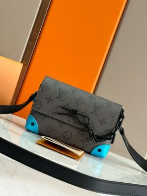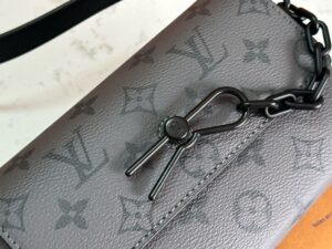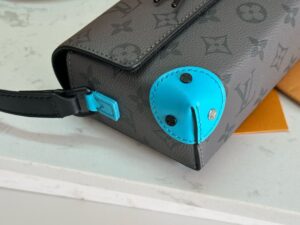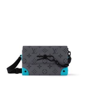 The Steamer Wearable Wallet takes on a summery feel in Monogram Eclipse Reverse canvas with colored cowhide-leather trim. The adjustable strap and reinforced corners are in a vivid turquoise, bringing a jolt of color to the monochromatic canvas. The hardware, including the signature pin-and-chain closure and the rivets on the reinforced corners, are black.