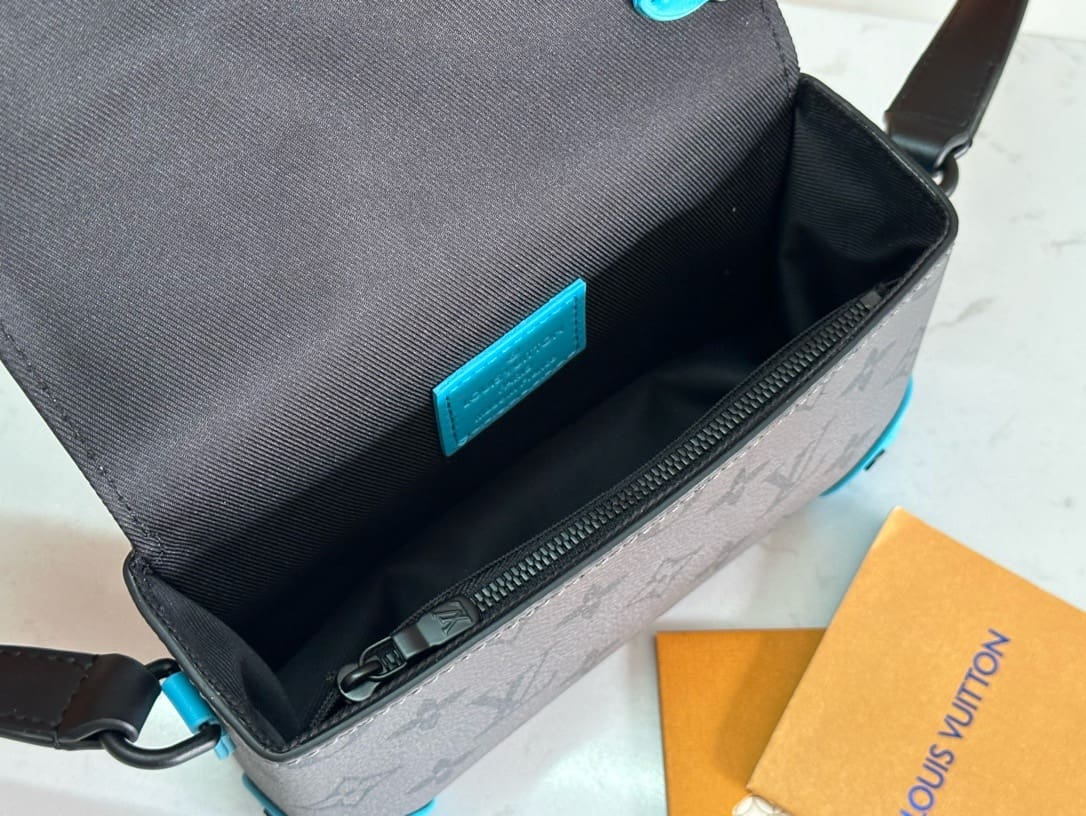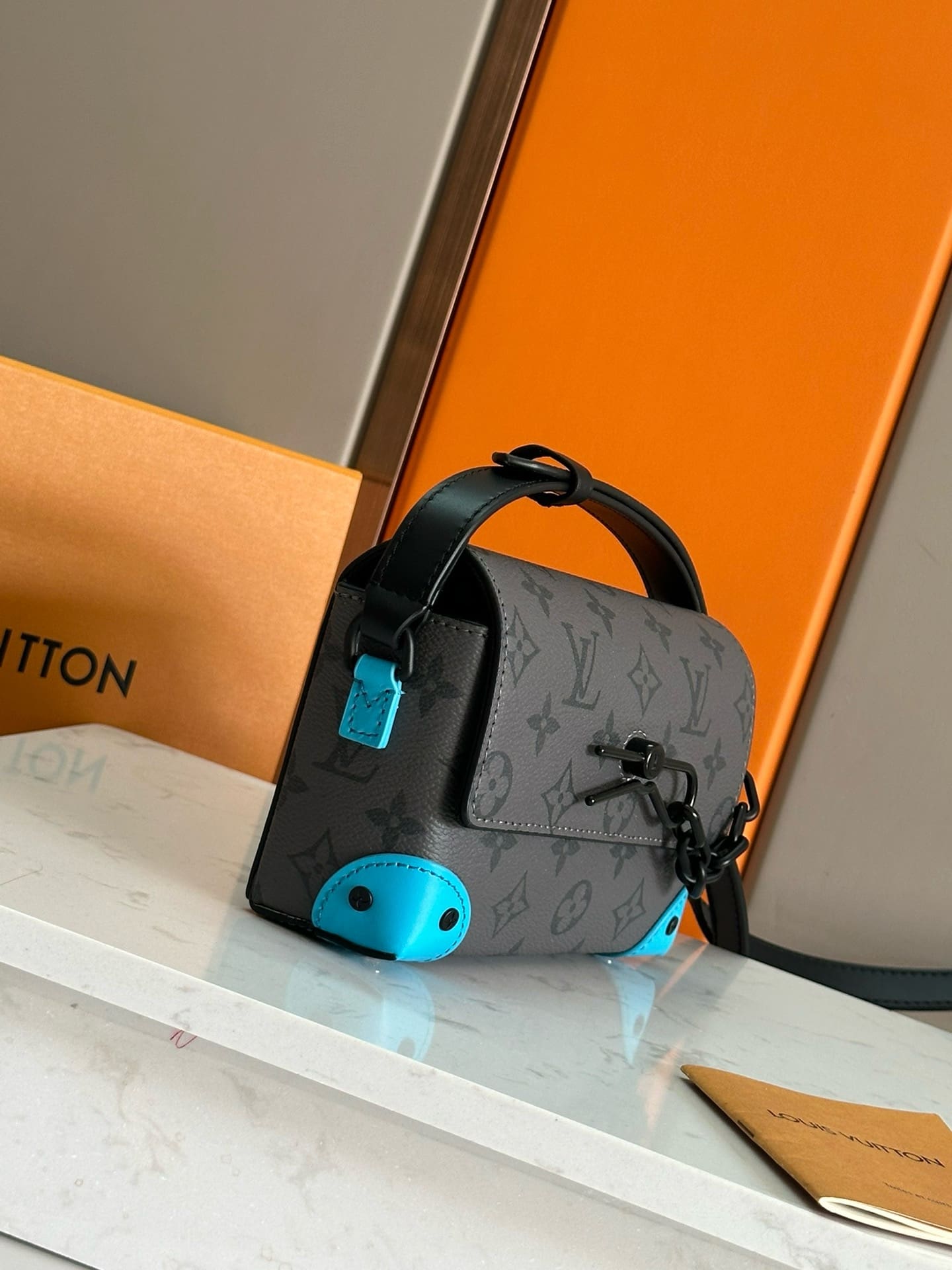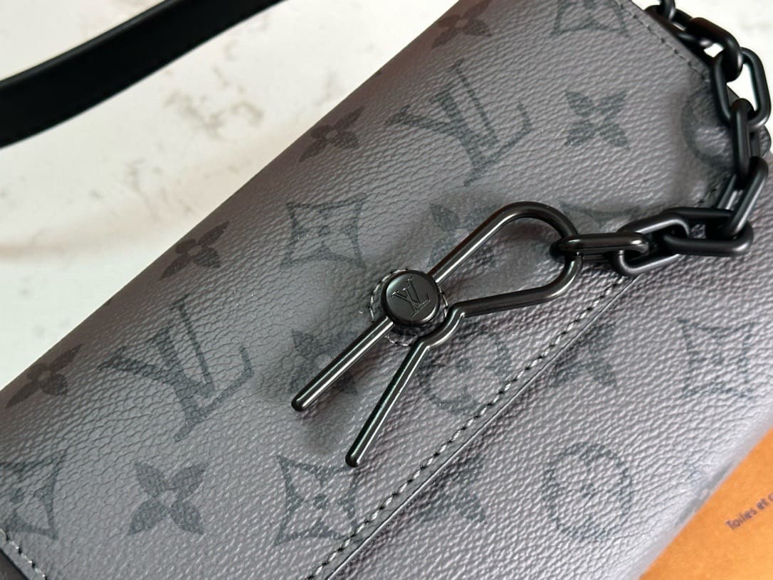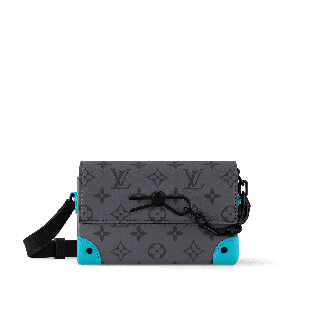 The Steamer Wearable Wallet takes on a summery feel in Monogram Eclipse Reverse canvas with colored cowhide-leather trim. The adjustable strap and reinforced corners are in a vivid turquoise, bringing a jolt of color to the monochromatic canvas. The hardware, including the signature pin-and-chain closure and the rivets on the reinforced corners, are black.