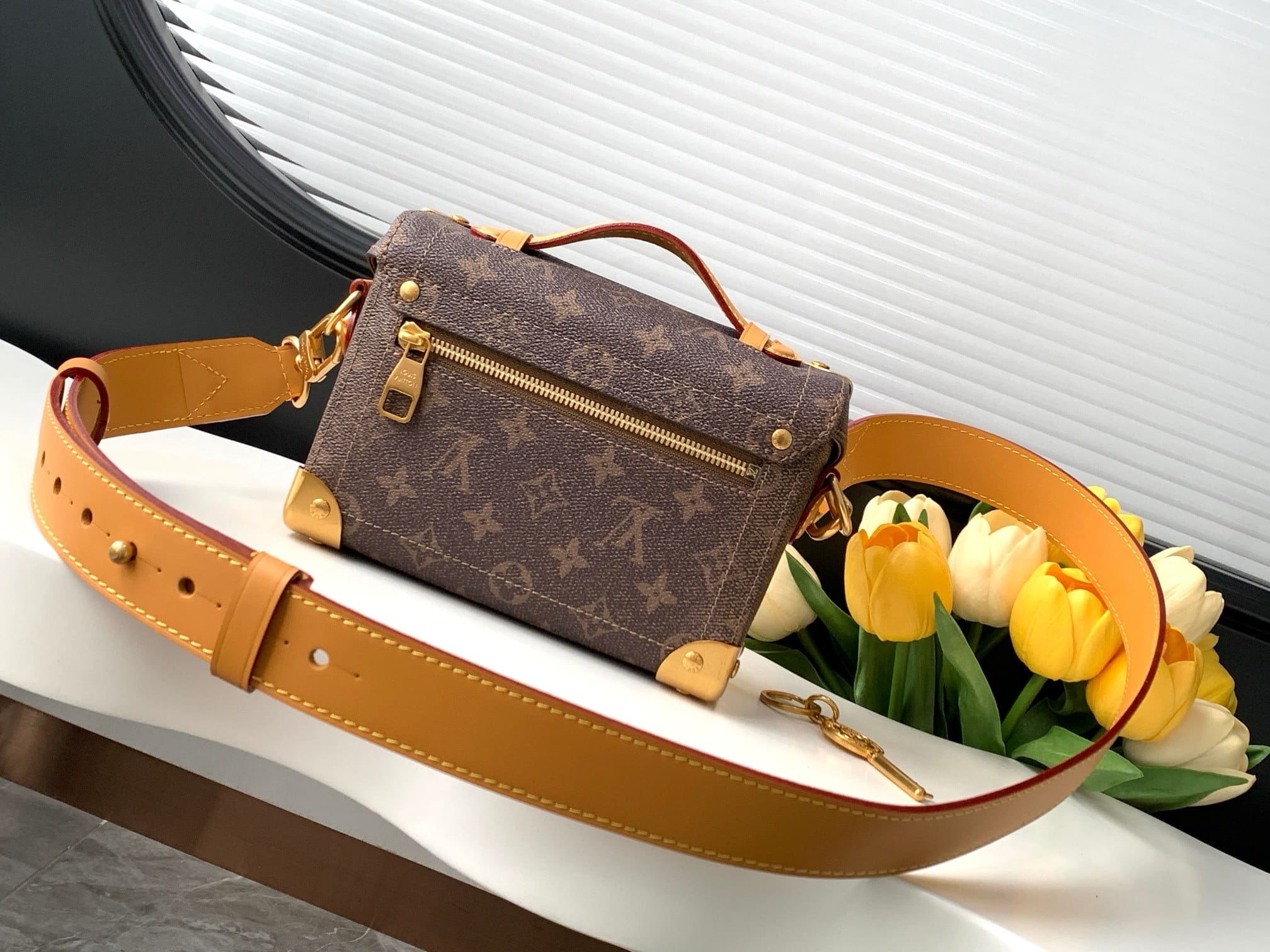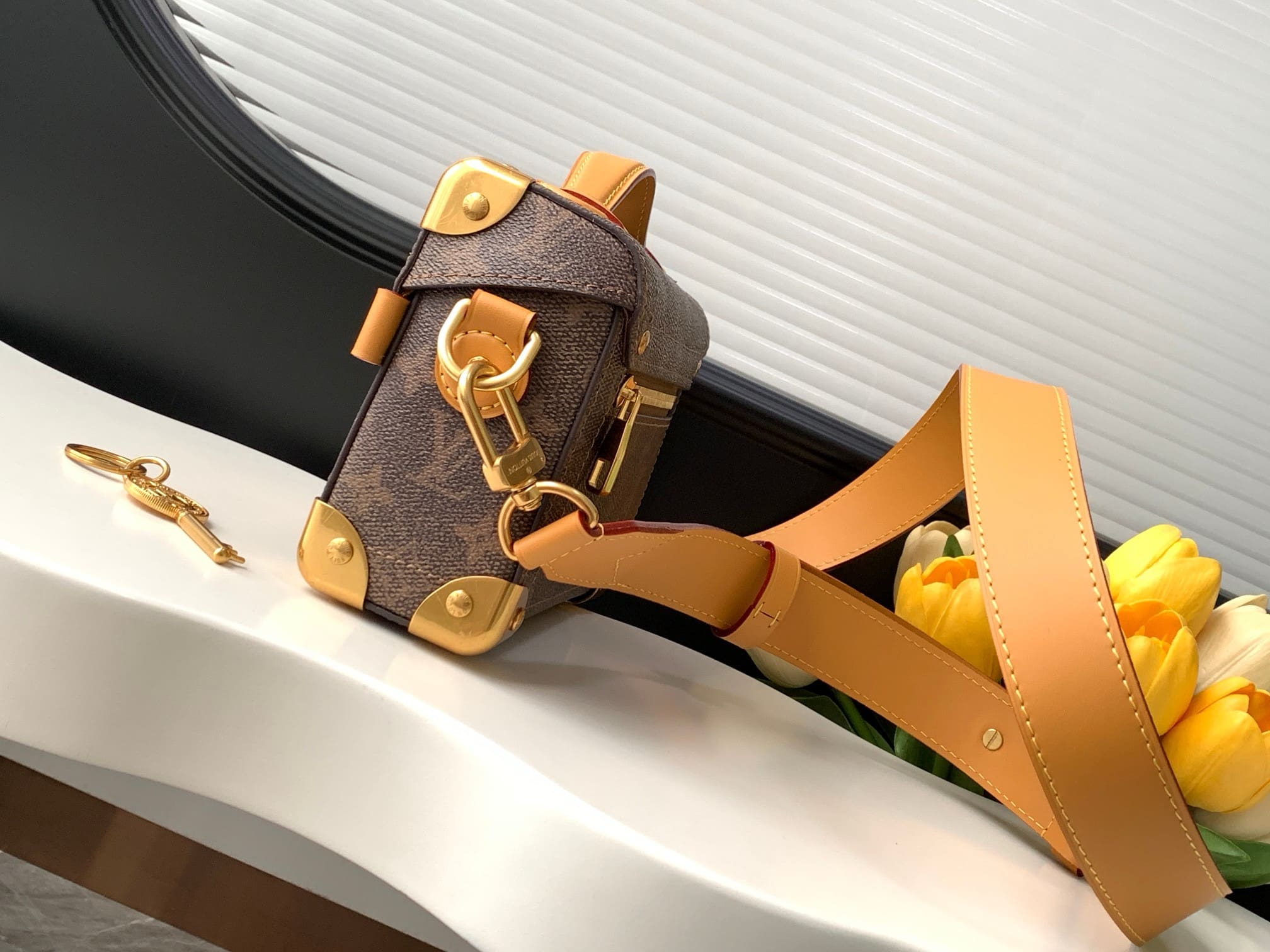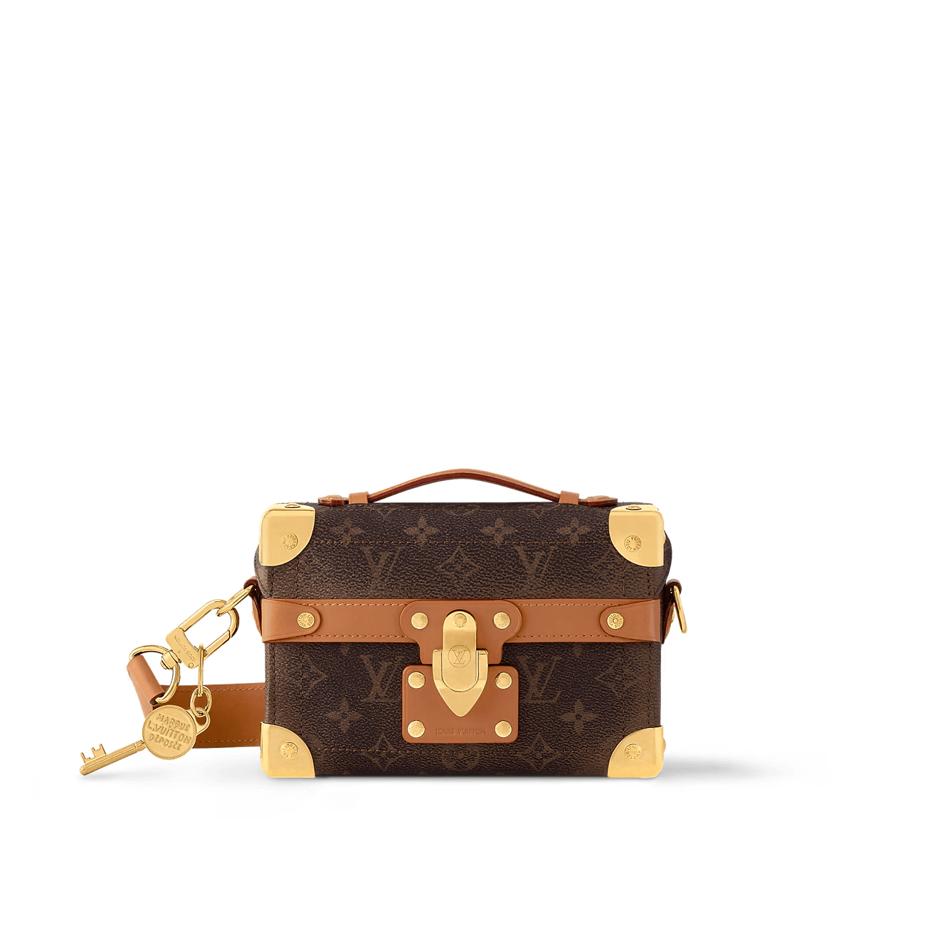Monogram Dust canvas, with its weathered look, brings rustic charm to the Soul Trunk cross-body bag. The patina on the leather and hardware perfectly complements the faded Monogram Flowers and LVs. This compact bag from Pharrell Williams boasts all the codes of the Soul Trunk family: reinforced corners, stitching, leather details, and the tumbler lock.