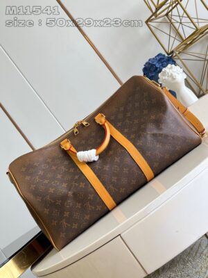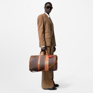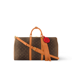 Unveiled at the Fall-Winter 2024 show, this Keepall Bandoulière 50 is fashioned from Monogram Dust coated canvas for a vintage allure. Paired with aged cowhide and gold-toned hardware, this bag is Pharrell Williams’ homage to the Maison’s heritage. It is signed with the red “Marque L.Vuitton Déposée” charm and the fringed leather name tag.
