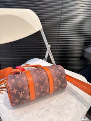 The Keepall Bandoulière 25 takes on a western feel in Pharrell Williams’ new Monogram Dust canvas, with its faded treatment of the iconic Monogram pattern. The two top handles, removable shoulder strap, and lateral reinforcement bands are all in aged cowhide leather. This small city bag can fit a phone, wallet, and other smaller items.