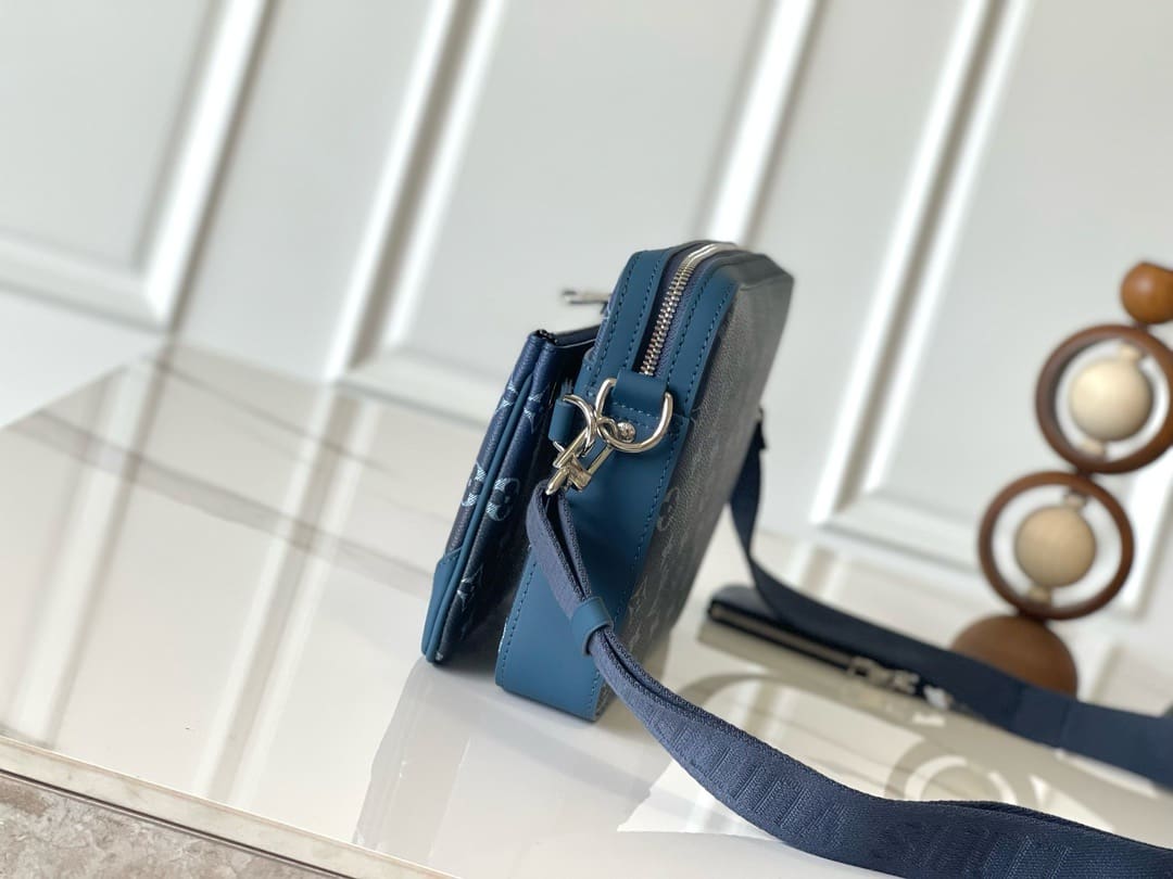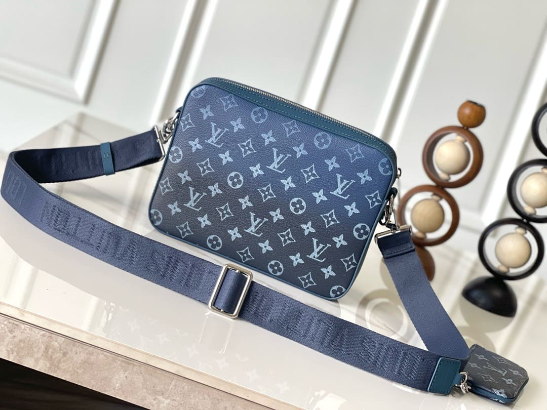 Fashioned from Monogram Gradient canvas, the modular Trio Messenger intrigues with its vanishing Monogram print: a subtle gradient treatment in which the Monogram goes from vibrant to more and more faded. The Trio features a front pocket, that’s actually a detachable pouch, and a coin purse attached to a D-ring on the removable strap.