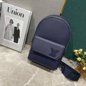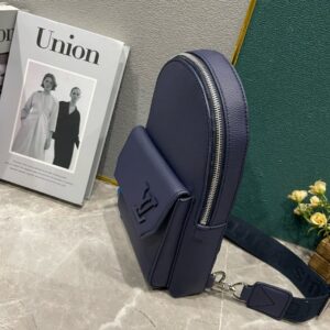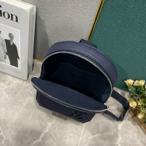 Like a miniature version of the Takeoff Backpack, the Pilot Slingbag in grained cowhide leather features a front pocket with the same precision-cut corners on the flap and the same LV Initials in tone-on-tone metal. The adjustable strap can be attached to either of the D-rings, situated on the left or right side of the bag.