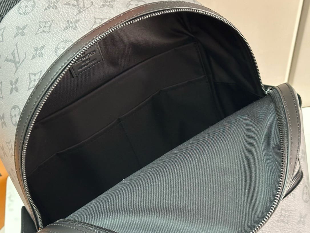 The Discovery Backpack PM is made from Monogram Eclipse Reverse canvas with its black-and-gray Monogram. The motif is livened up with turquoise on the leather label on the front pocket, around the zipper, and on the top handle. Its zipped front pocket and two open side pockets make this is a great everyday bag.