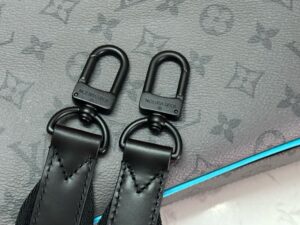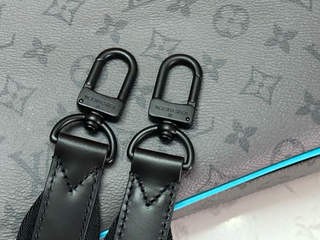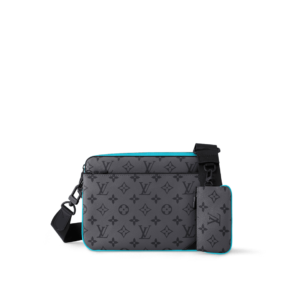 Fashioned from Monogram Eclipse Reverse canvas with turquoise highlights, the Trio Messenger bag is three bags in one. In additional to the main pouch, there’s a detachable zipped pocket on the front, and removable coin purse attached to the strap. An adjustable and removable textile strap, signed Louis Vuitton, enables comfortable shoulder carry.