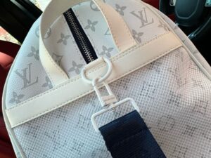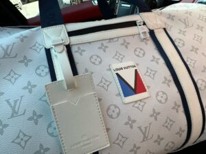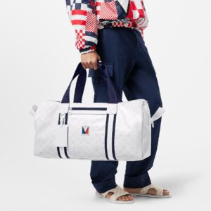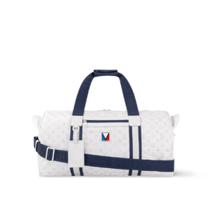 Part of the 37th America’s Cup collection, the Keepall Sport bag is made from Monogram Storm canvas, a water-resistant canvas with subtle Monogram embossing. The sporty colorway, aqua-zips for protection against moisture, and the LV fast-release buckle, all evoke the maritime world of the America’s Cup. A removable strap and top handles give carry options.