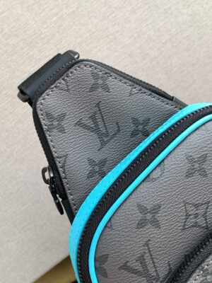 The Avenue Slingbag PM is made from Monogram Eclipse Reverse canvas, with turquoise-color leather trim. An alternative to the classic backpack, this cross-body bag features a zipped main compartment and a roomy front zipped pocket. And for those smaller items, there’s a triangular pocket where the strap meets the bag.
