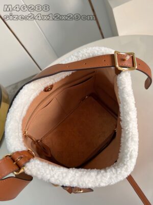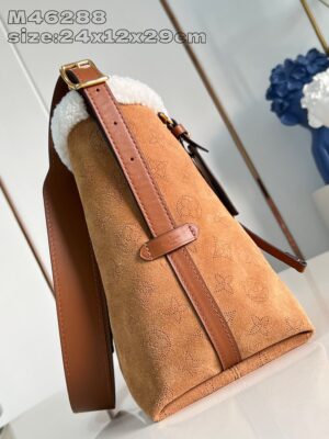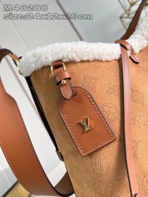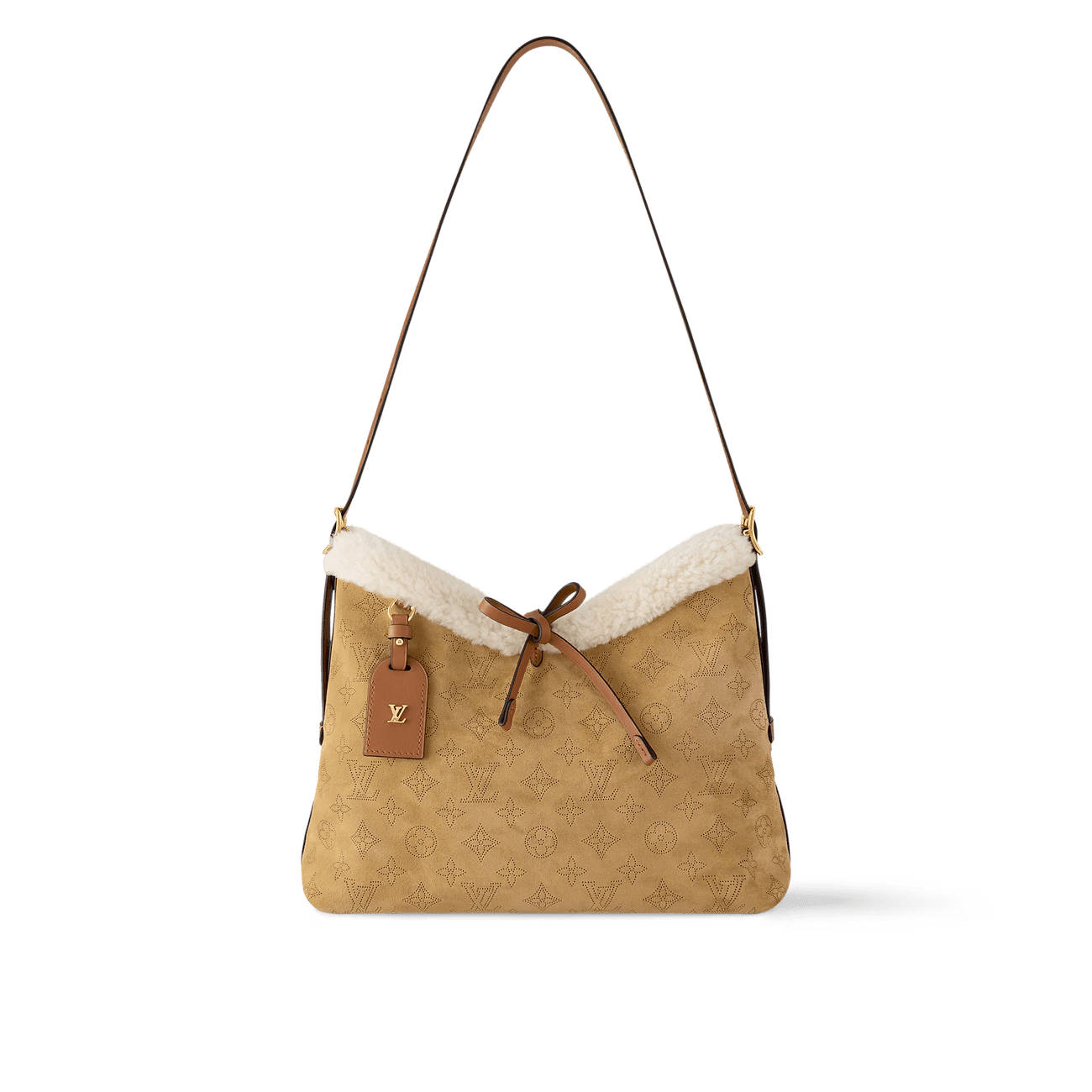 The iconic CarryAll PM adopts a warm and winter style with this luxurious edition from the LV Ski collection. It is crafted from Mahina suede adorned with Monogram perforations and is trimmed with merino-sourced shearling for a cozy finish. The capacious design secures with a magnetic closure and leather ties, and will comfortably fit a long wallet, as well as other daily essentials.