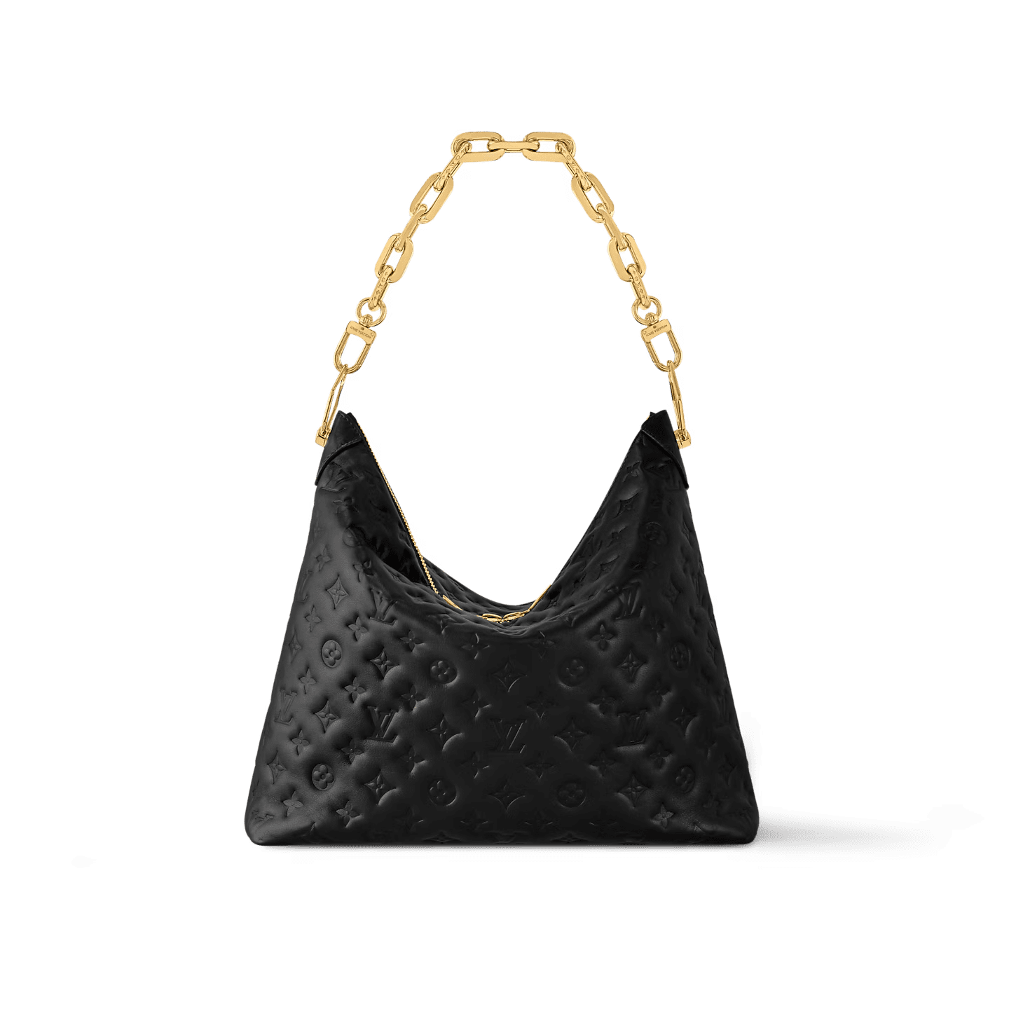 A statement addition to the Coussin line, this new Hobo model strikes the balance of fashionable and functional. Showcasing signature design details from the collection, it is crafted from smooth padded leather embossed with the House’s Monogram and has an iconic chunky chain accented with gold-toned hardware. The large removable textile strap offers multiple wearing options. This versatile piece also includes a removable zipped pouch and is sized to store a laptop.