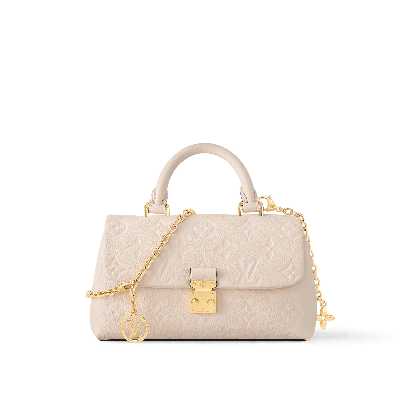 The Nano Madeleine in Monogram Empreinte leather is a miniaturized version of the emblematic Madeleine bag. It is adorned with an iconic S-lock closure and a removable chain embellished with an LV Circle charm. The versatile design is roomy enough to store everyday essentials and can be worn cross-body, over the shoulder or carried by hand.