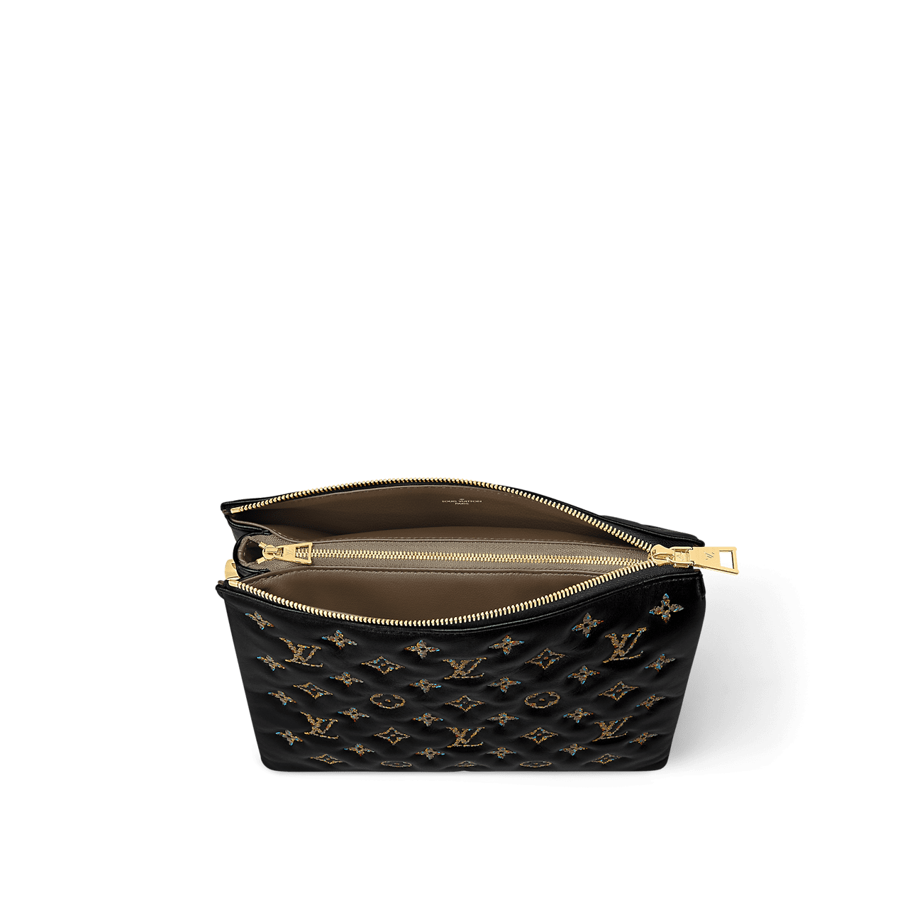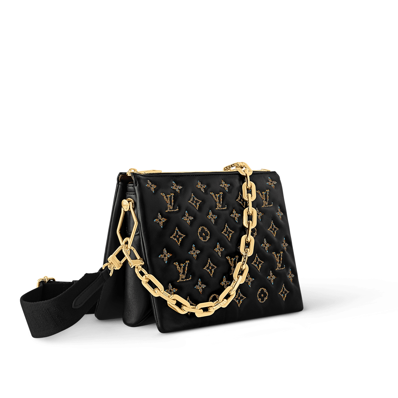 Designed to match the elegant tweed look from the RTW Fall-Winter 2024 runway, this Coussin PM is a true showpiece. It is crafted from puffy lambskin embossed with the House’s signature Monogram in golden tweed – a detail that’s beautifully complemented by the matching chain. Fitted with a secure zip closure, it opens to reveal three compartments to organize everyday essentials. Wear it cross-body or as a clutch.