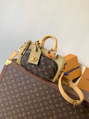 The Keepall Bandoulière 25 is made from beige grained leather with tonal suede details and hardware with an aged-gold aspect. The bag’s revamped design includes an outside zipped pocket in Monogram canvas, providing easy access to essentials. The pocket closes with a cord zip-pull. A removable and adjustable leather strap enables shoulder carry.