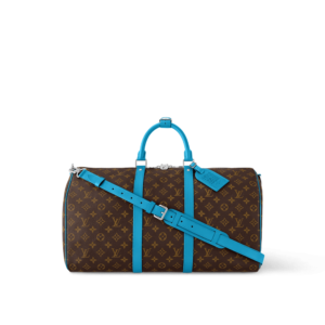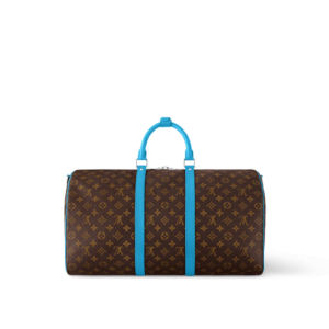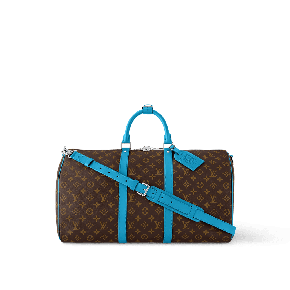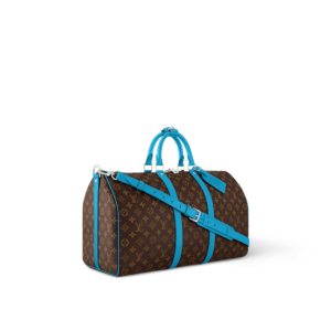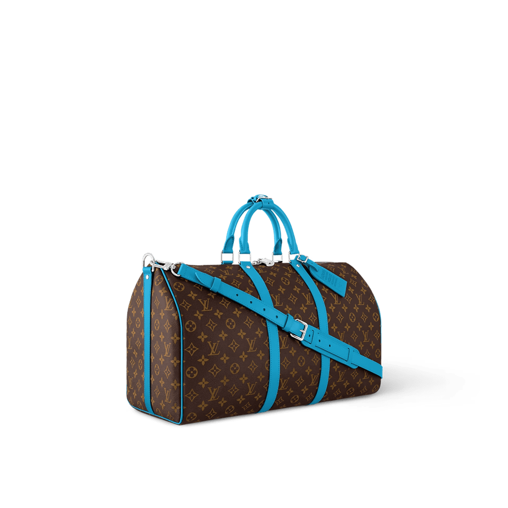 Brightly colored leather details bring a fresh feel to this Keepall Bandoulière 50 travel bag in Monogram Macassar canvas. The top handles, the removable shoulder strap, even the leather name tag, are all in the same bright color. The bag is lined in a striped textile inspired by the linings of the House’s original trunks.