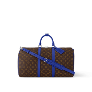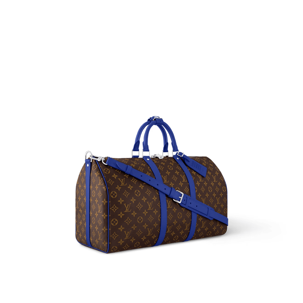 Brightly colored leather details bring a fresh feel to this Keepall Bandoulière 50 travel bag in Monogram Macassar canvas. The top handles, the removable shoulder strap, even the leather name tag, are all in the same bright color. The bag is lined in a striped textile inspired by the linings of the House’s original trunks.