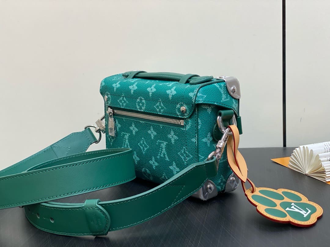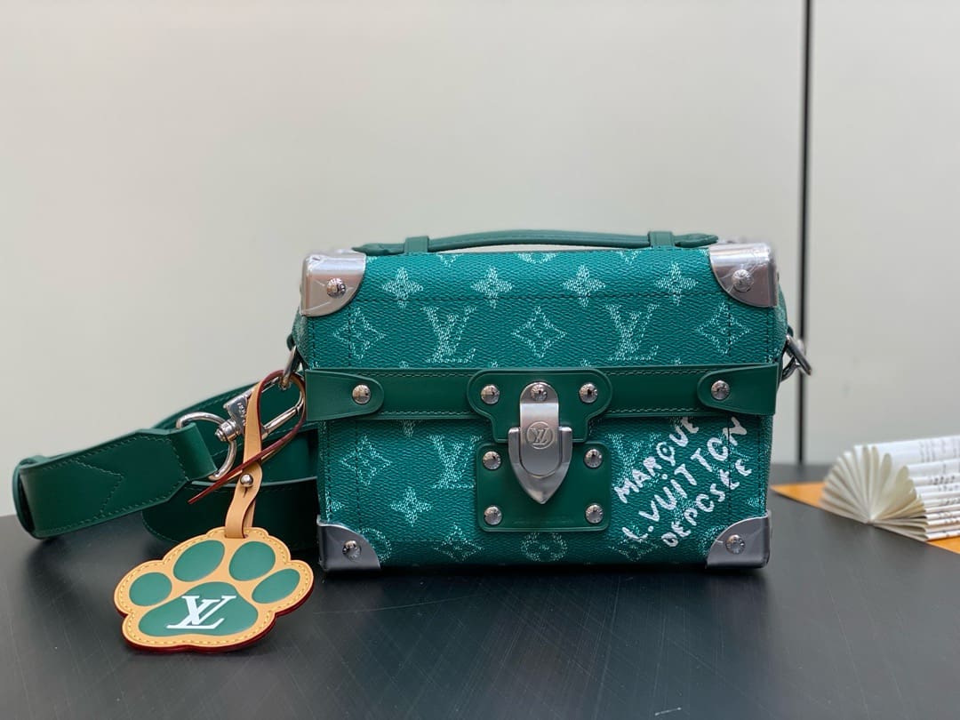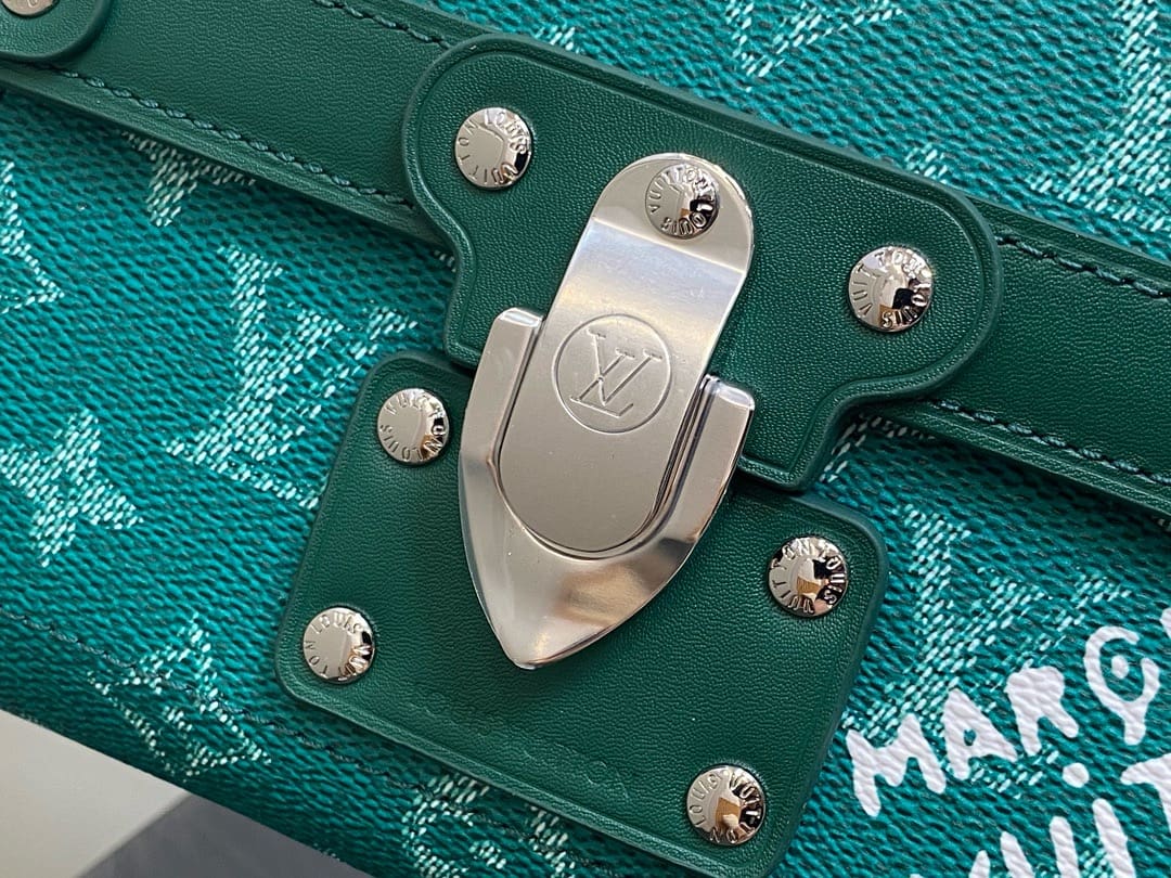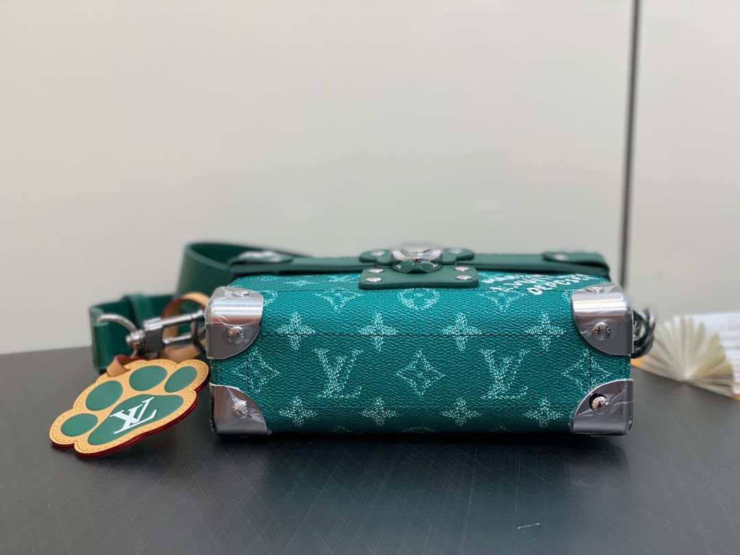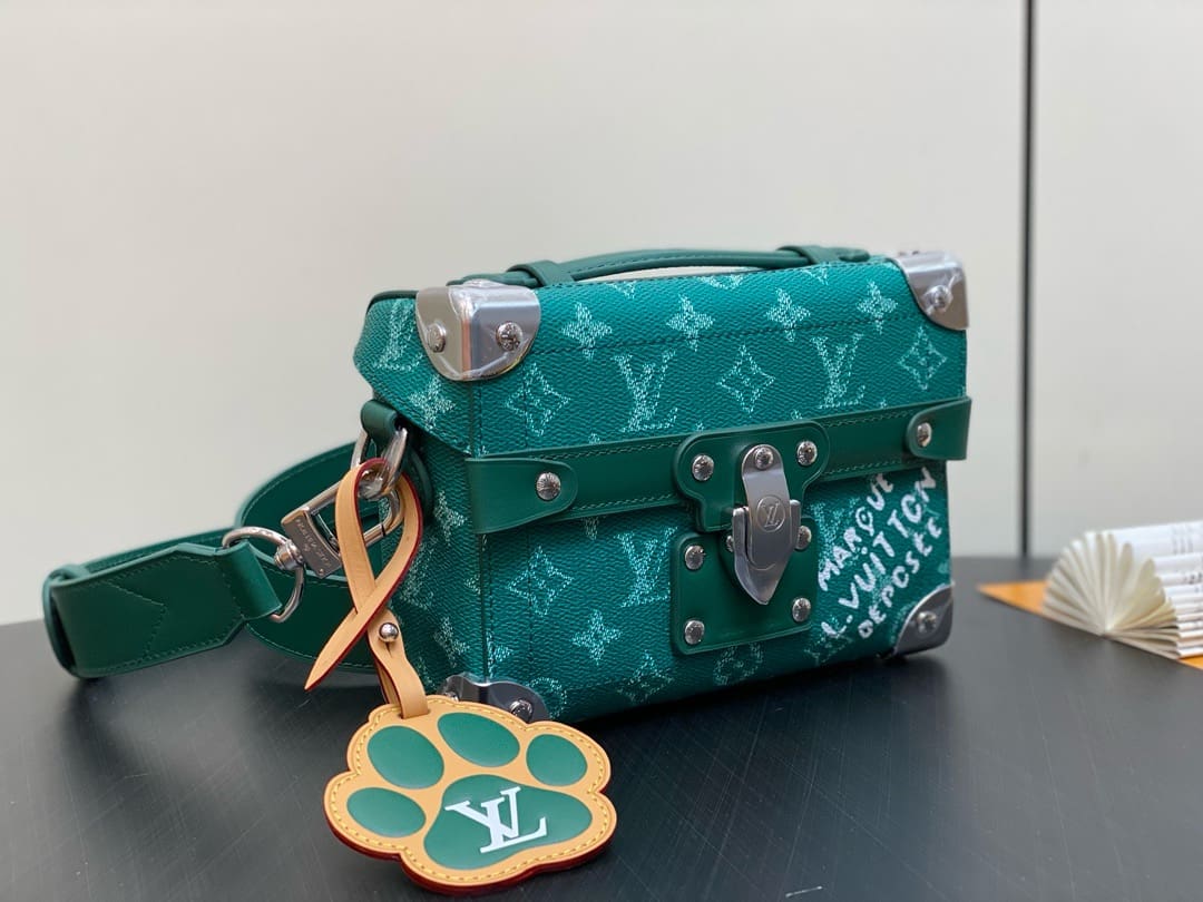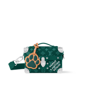 The Soul Trunk is a compact cross-body bag made from bright Monogram Heritage canvas, with silver-toned corners and lock. The result of Pharrell Williams’ mixing of House codes, the bag features the “Marque L.Vuitton Déposée” signature, usually seen on Damier canvas. A removable charm in the shape of a dog’s paw with LV Initials signs this bag.