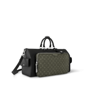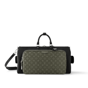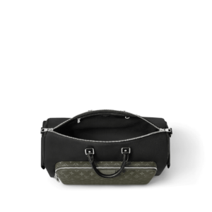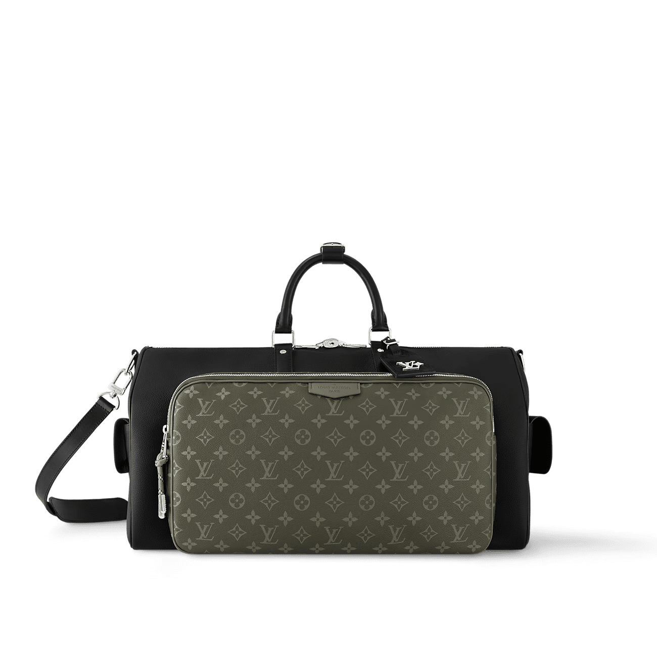 Part of the LV Park collection, the iconic silhouette of the Keepall Bandoulière 50 is reimagined with outside pockets that bring versatility. Made from Monogram coated canvas, the zipped side pocket perfectly complements the grained black leather of the bag, creating a patchwork feel. It features a removable LV Lovers name tag in suede.