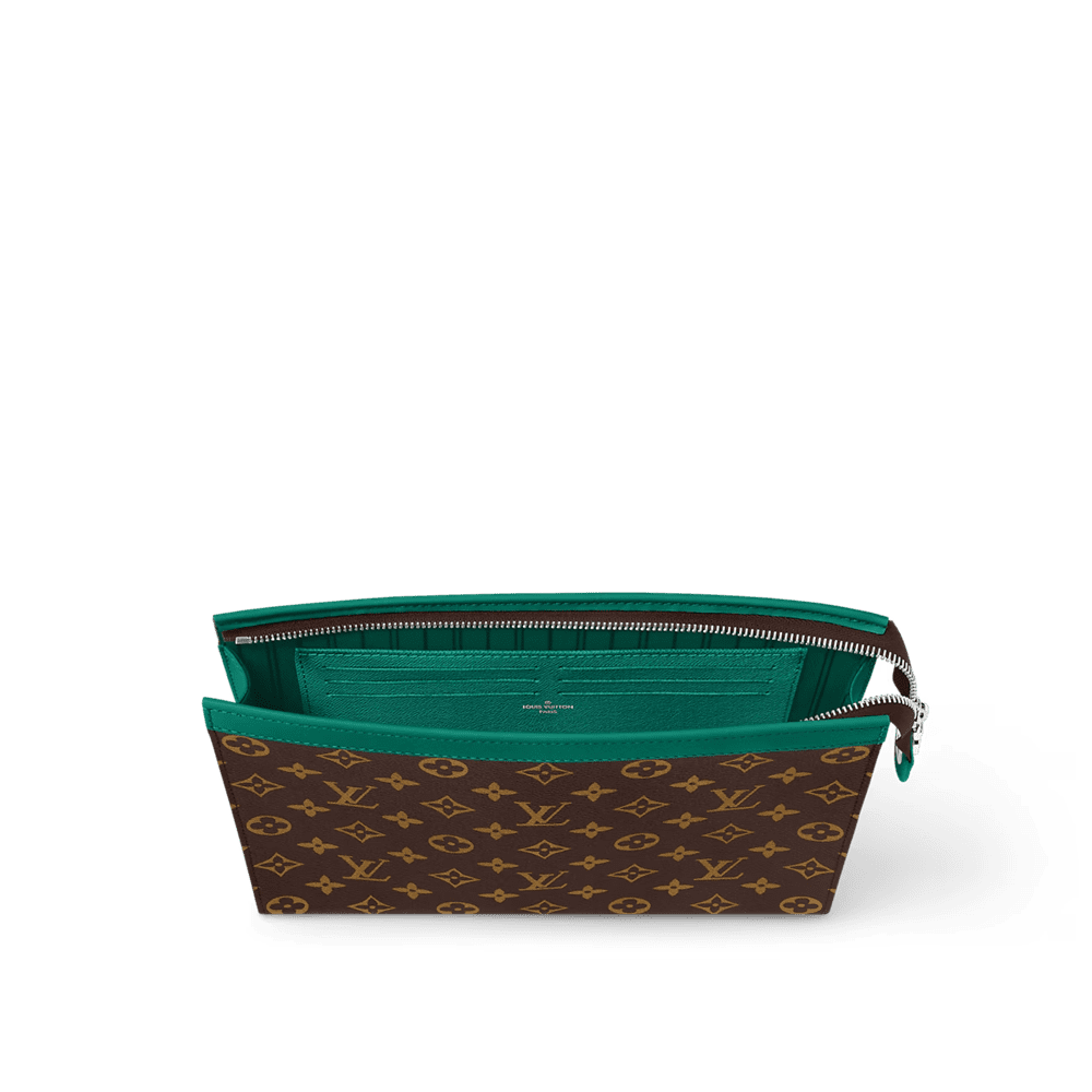The versatile Pochette Voyage MM is made from Monogram Macassar coated canvas, with colored leather trim and a matching-colored lining. Ideal for organizing items inside a suitcase, it can also be carried as a clutch bag. The zipped closure, interior card slots, and inside flat pocket make it a practical pouch.