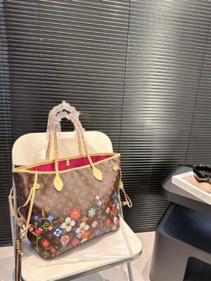This timeless Neverfull MM handbag combines two iconic signatures as part of the celebratory re-edition of the Louis Vuitton x Murakami collection. The spacious Monogram canvas body is playfully overlaid with Monogram Flowers that have been reworked in Takashi Murakami’s renowned superflat aesthetic. Natural cowhide leather highlights the top, the handles and the side ties, while the inside is lined with colorful striped fabric. Complete with a zipped interior pocket and a removable pouch.