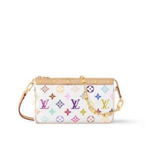 This playful edition of the classic Pochette Accessoires is joyfully reimagined with a multicolored Monogram motif as part of the cross-category Louis Vuitton x Murakami collection. Crafted from coated canvas in a petite pouch shape, a natural cowhide-leather trim adds an emblematic House touch, while golden hardware introduces a chic polished accent. Complete with a removable strap and chain for versatile styling options.