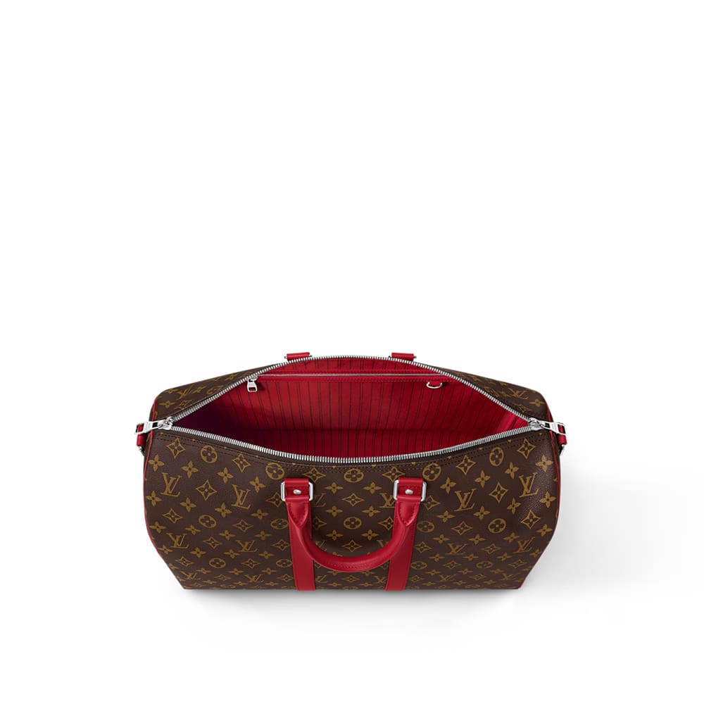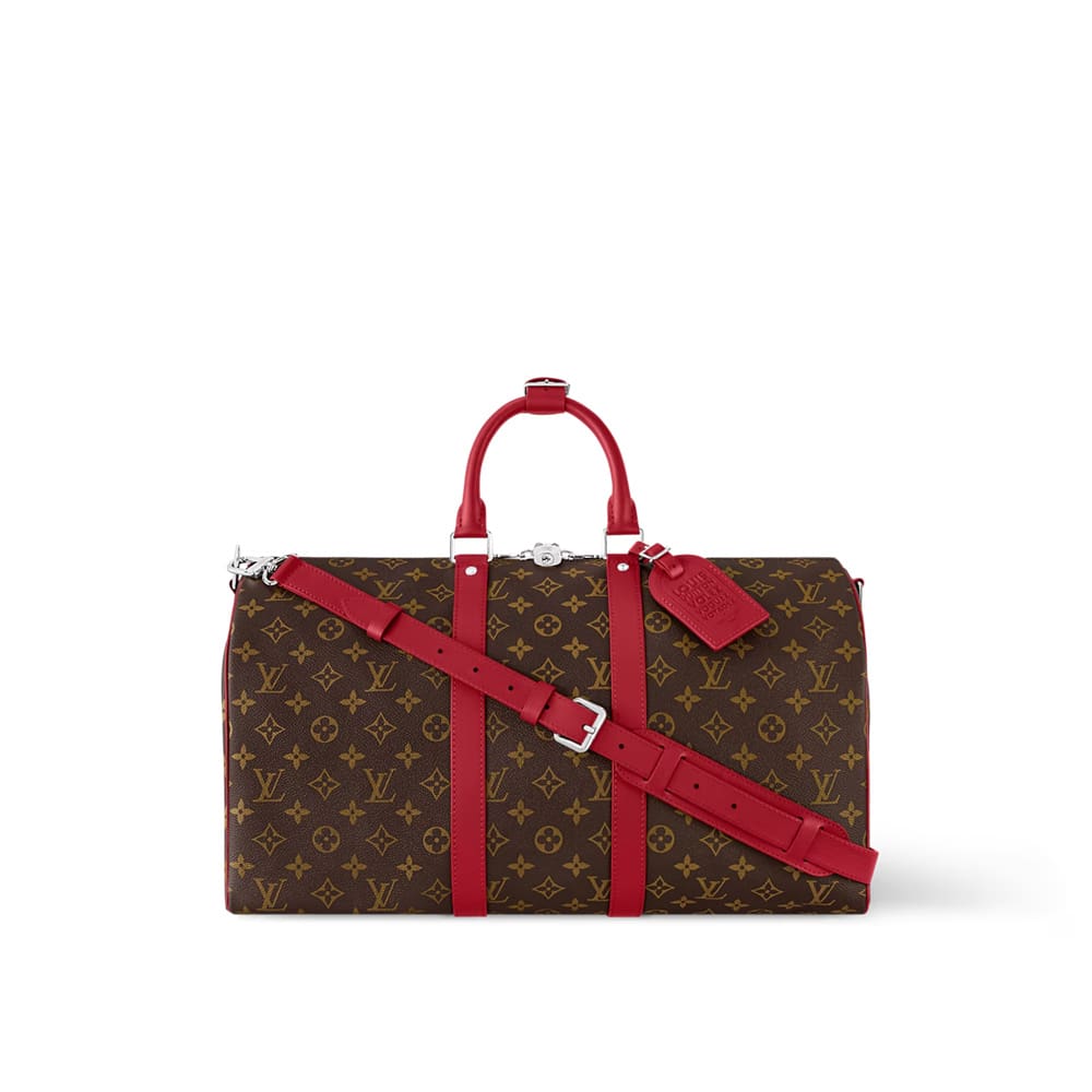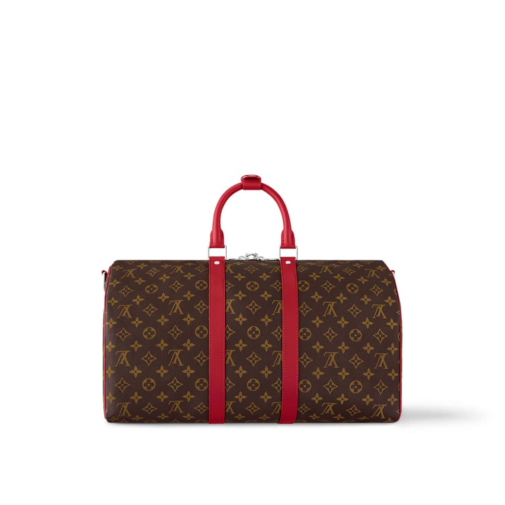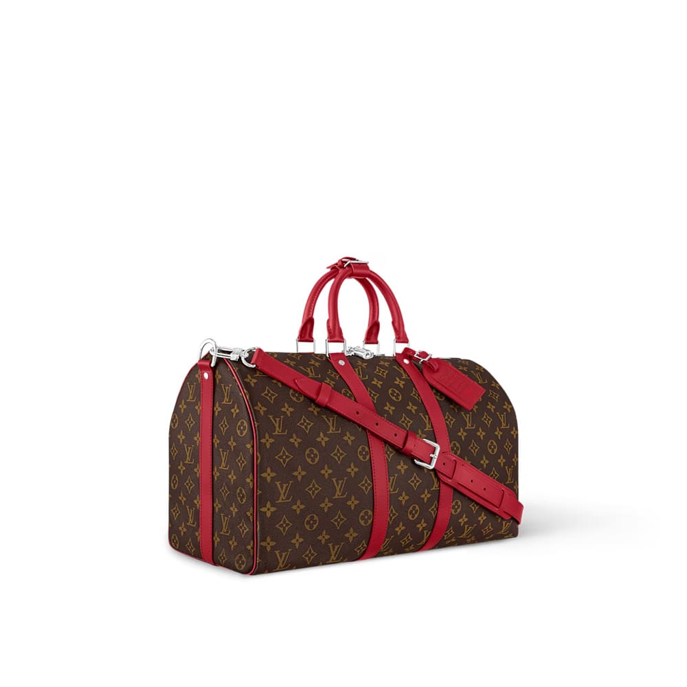 The Keepall Bandoulière 45 bag is made from Monogram Macassar coated canvas with colorful leather trim, as part of the second chapter of the LV Colormania collection. The touches of color on the leather side bands, top handles, removable name tag, and detachable shoulder strap bring sophistication to this classic travel bag.