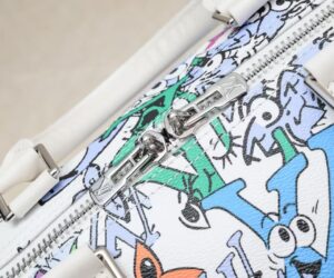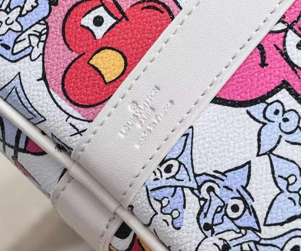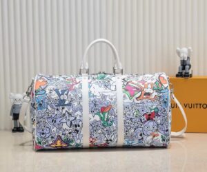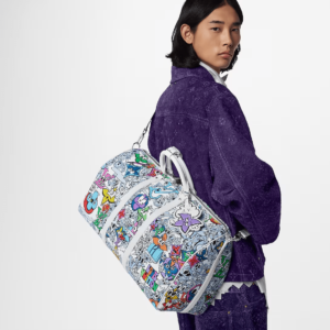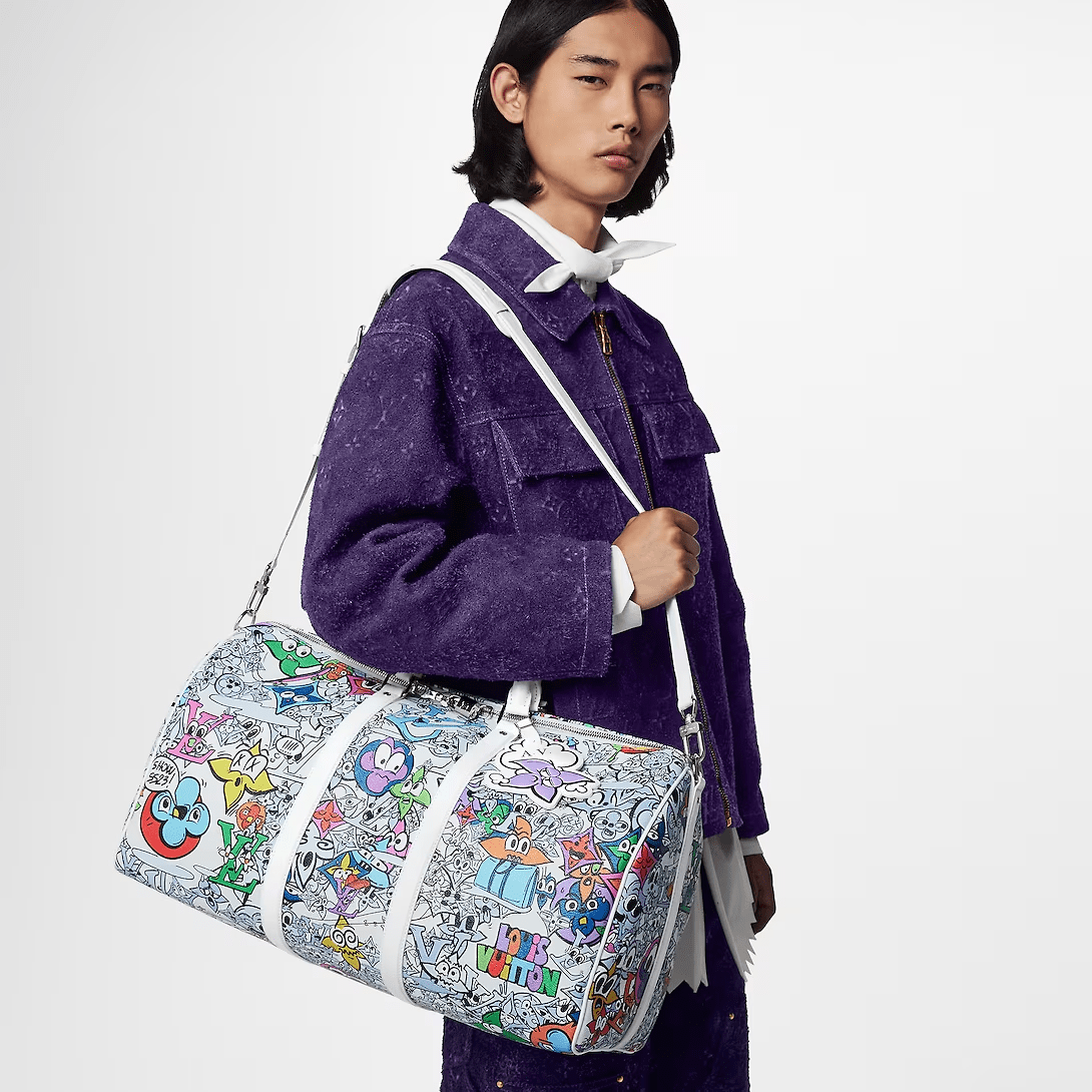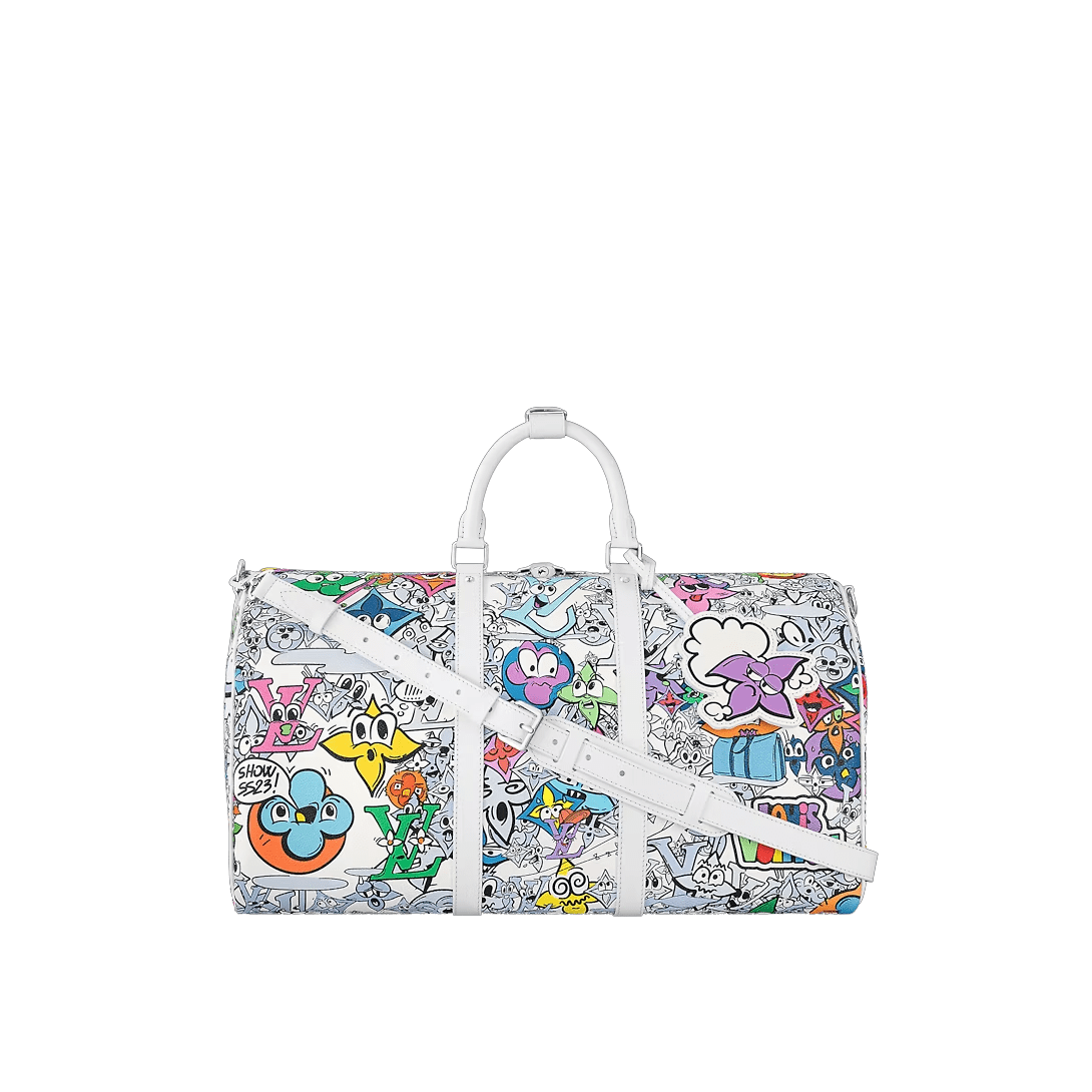 This Keepall Bandoulière 50 in canvas is adorned with a comic-book reimagining of the Monogram motif. Hundreds of characters, happy and sad, in the shape of Monogram Flowers and LVs adorn the bag. The top handles and lateral bands, in white leather, make it instantly recognizable as a Keepall. The cartoon name tag can be personalized.