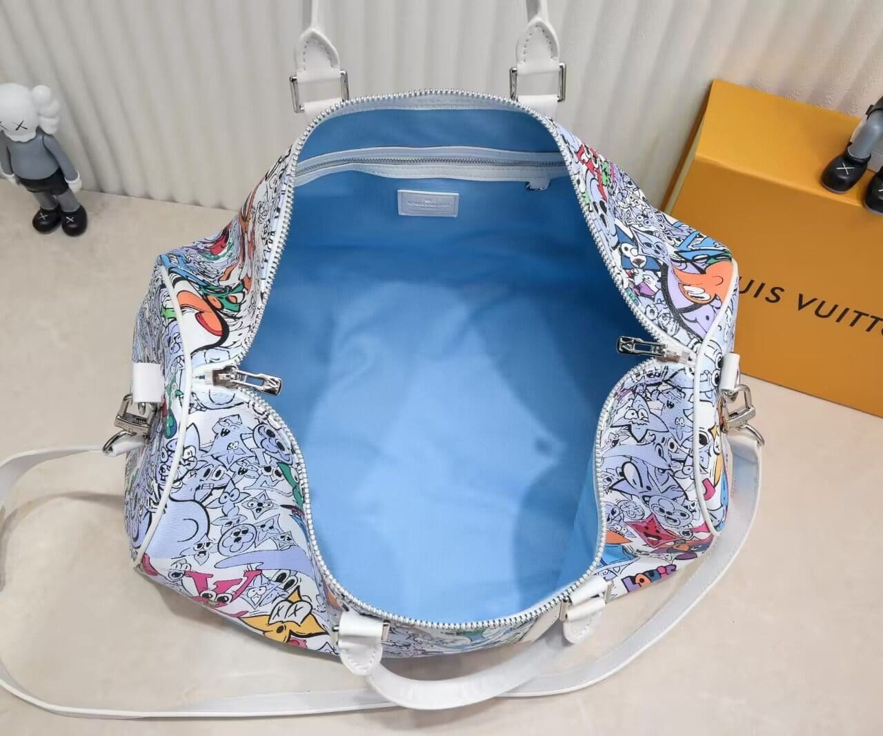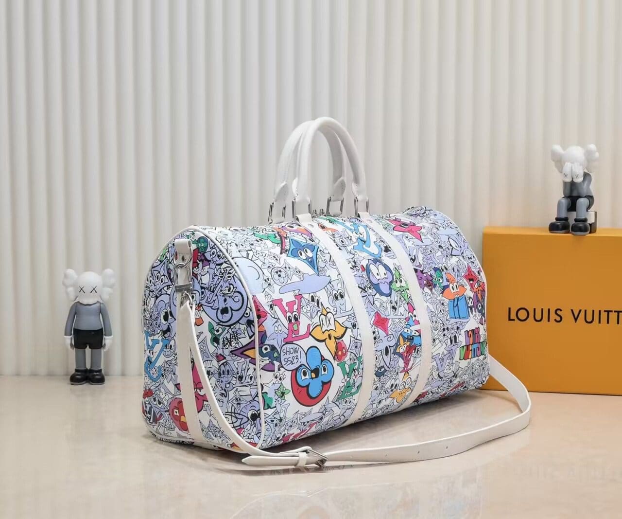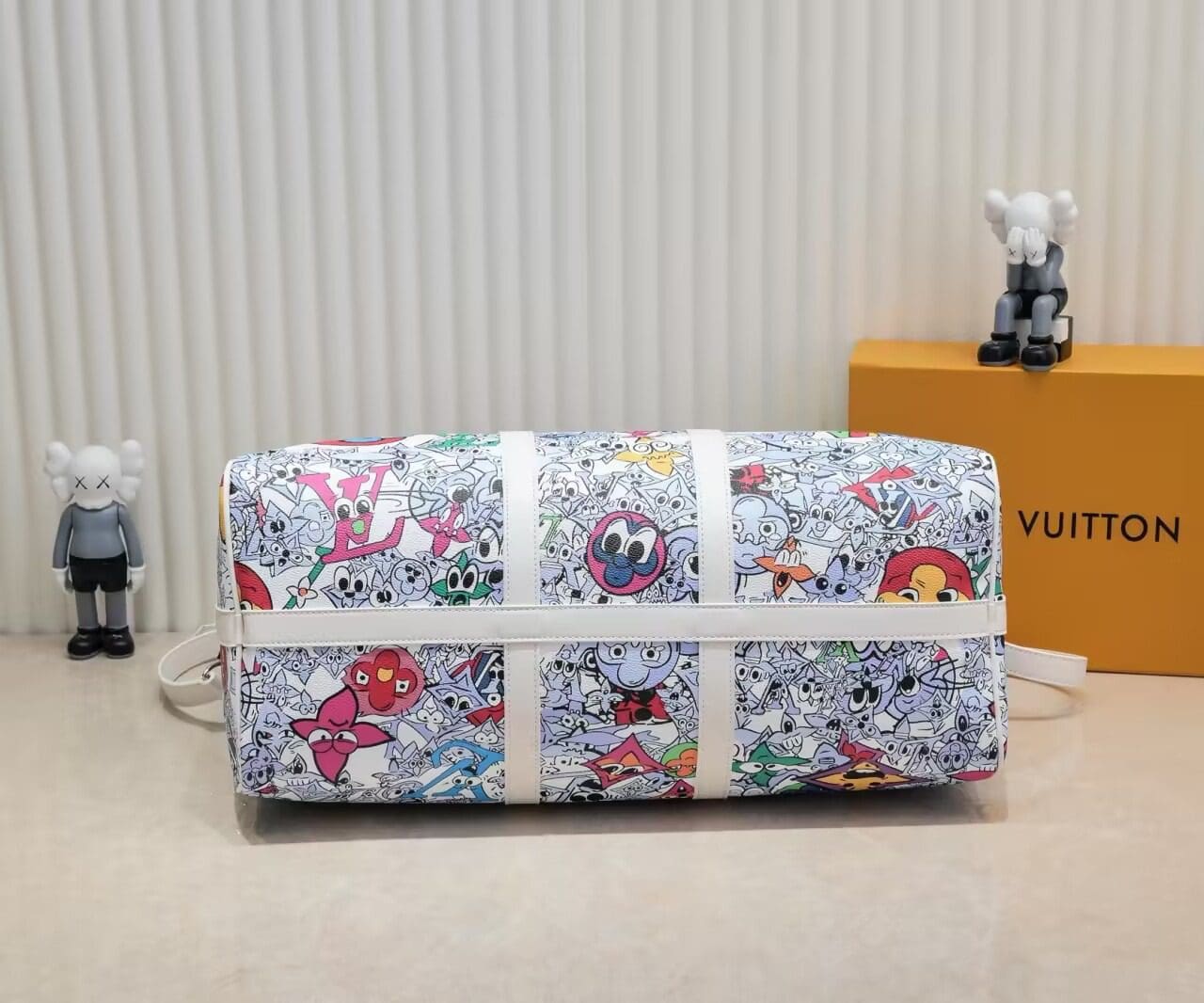 This Keepall Bandoulière 50 in canvas is adorned with a comic-book reimagining of the Monogram motif. Hundreds of characters, happy and sad, in the shape of Monogram Flowers and LVs adorn the bag. The top handles and lateral bands, in white leather, make it instantly recognizable as a Keepall. The cartoon name tag can be personalized.