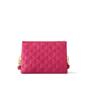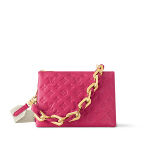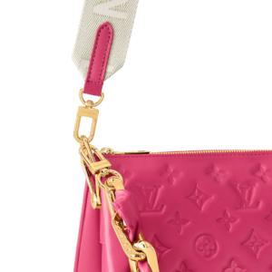 The Coussin PM handbag is made from puffy lambskin, embossed with the Monogram pattern. Lined with smooth cowhide, the inside of the bag is divided into two compartments by a zipped pocket. This body-friendly bag can be comfortably carried with its wide removable shoulder strap or with its leather braided chunky chain.